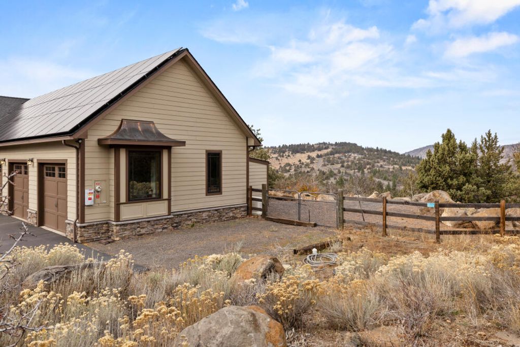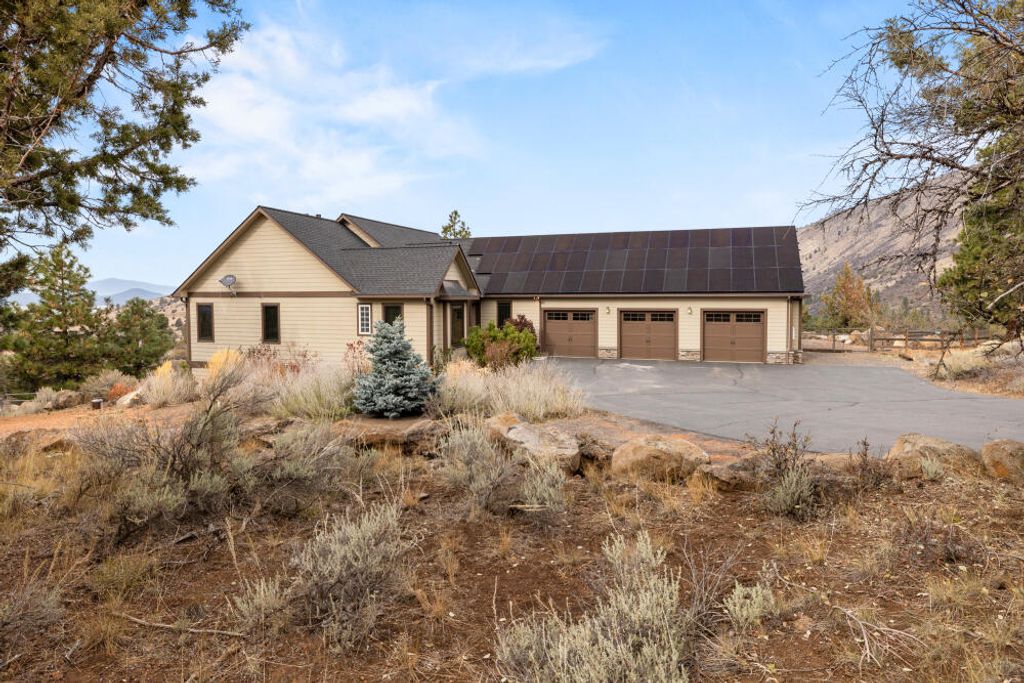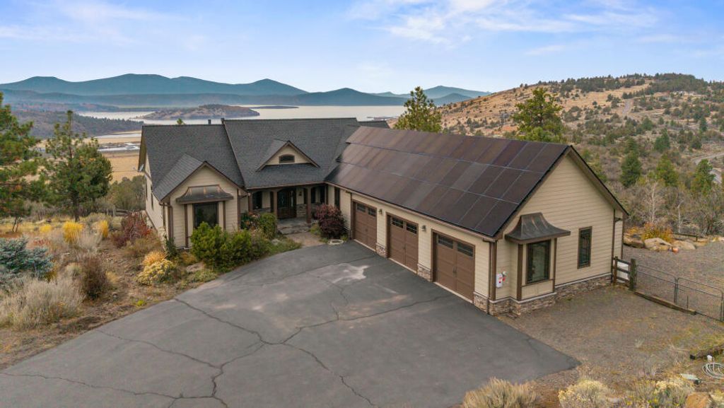 Luxury home on 5 acres w/panoramic views. This 4bed/3bath home in a gated community blends thoughtful elegance & efficiency with solar power & a backup Generac generator. The dramatic entry opens to the great room with hand-scaped wood floors, vaulted ceilings & picture windows. The open floor plan flows out to the Trex deck or into the dining area, then to the gourmet kitchen with stone countertops, high-end appliances & a breakfast nook surrounded by windows framing the mountain & lake views. The primary suite on the main floor offers his & hers walk-in closets & en suite bathroom w/ jetted tub & custom-tiled shower. Downstairs features a family rm opening to a patio w/built-in gas line for BBQ plus a bed, bath, office w/storage & bonus work rm w/backyard access. Off the utility rm the 3-bay garage includes a custom dog kennel system & ample storage for work and play. Beautiful and low-maintenance landscaping, fully fenced yard, RV parking w/possible hookups"”this property has it all