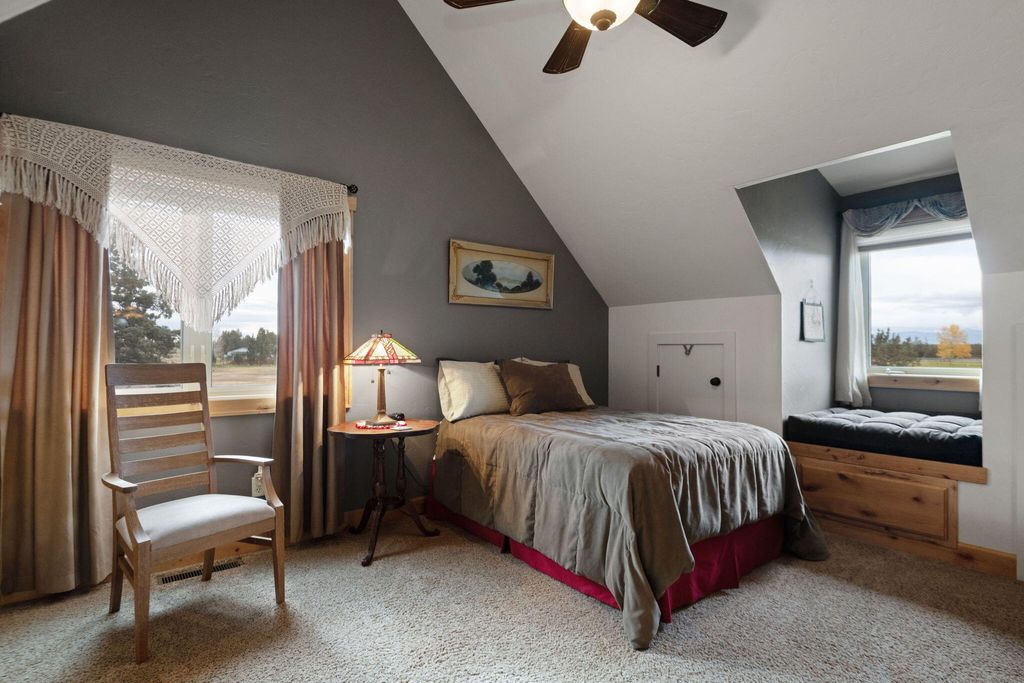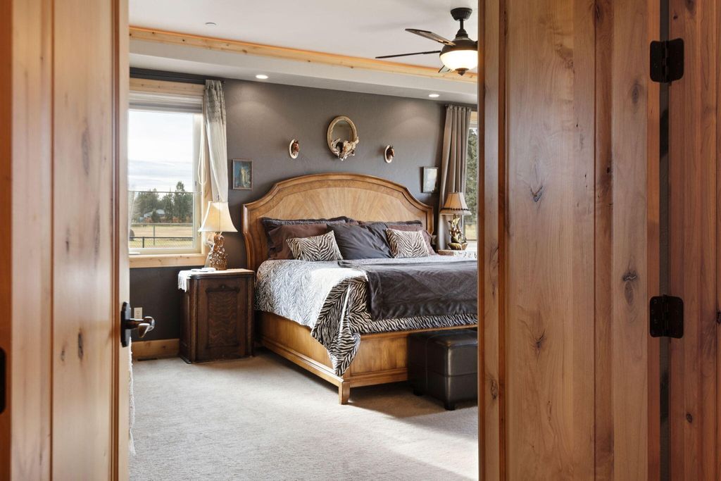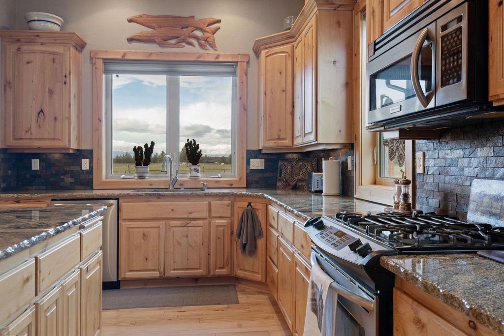 Beautiful custom home on 5.14ac with irrigation rights and surrounded by pristine properties with large homes. With amazing mountain views, gorgeous landscape, 2 ponds, lots of green grass on the property and neighboring properties this home is situated in paradise. The kitchen is a work of art with granite counters, soft close knotty alder drawers & cabinets, stainless steel appliances, and a wine bar. The rest of the home also has matching knotty alder cab. Other cozy home features include: Hickory custom wood floors, cultured stone columns, custom solid alder 8' doors and matching trim, 10' ceilings, and custom tile in the bathrooms. Office next to kitchen. Lrg master on main w/ fireplace & huge walk-in closet. Master bth has a heated tile floor and large doorless tile shower with multiple hds. Electric heat pump with ac and propane as backup. 3 car garage is heated with 2 man doors. Driveway is gated and paved. 1000sqft mahogany deck, RV dump, Fire sprinklers, & new well pump '22.