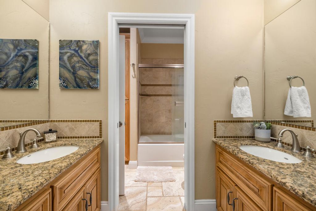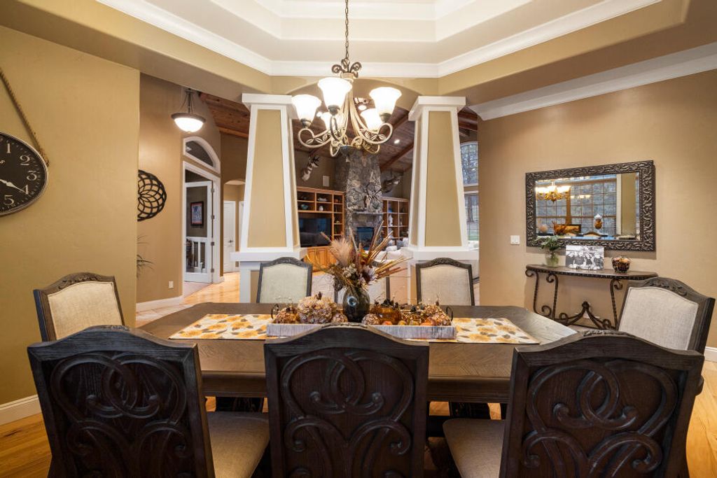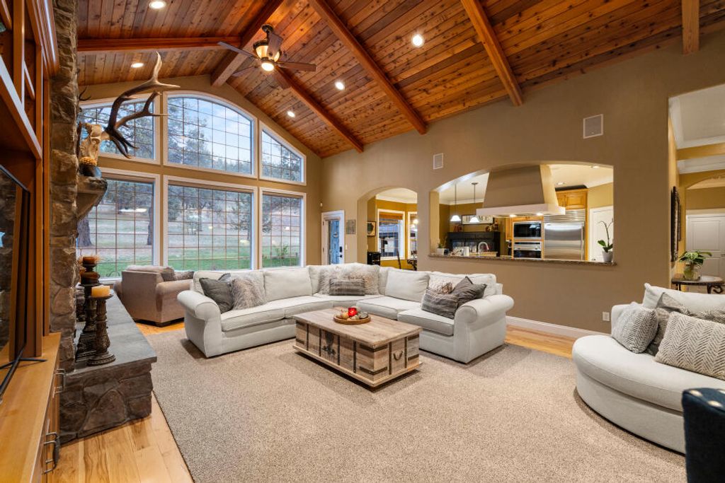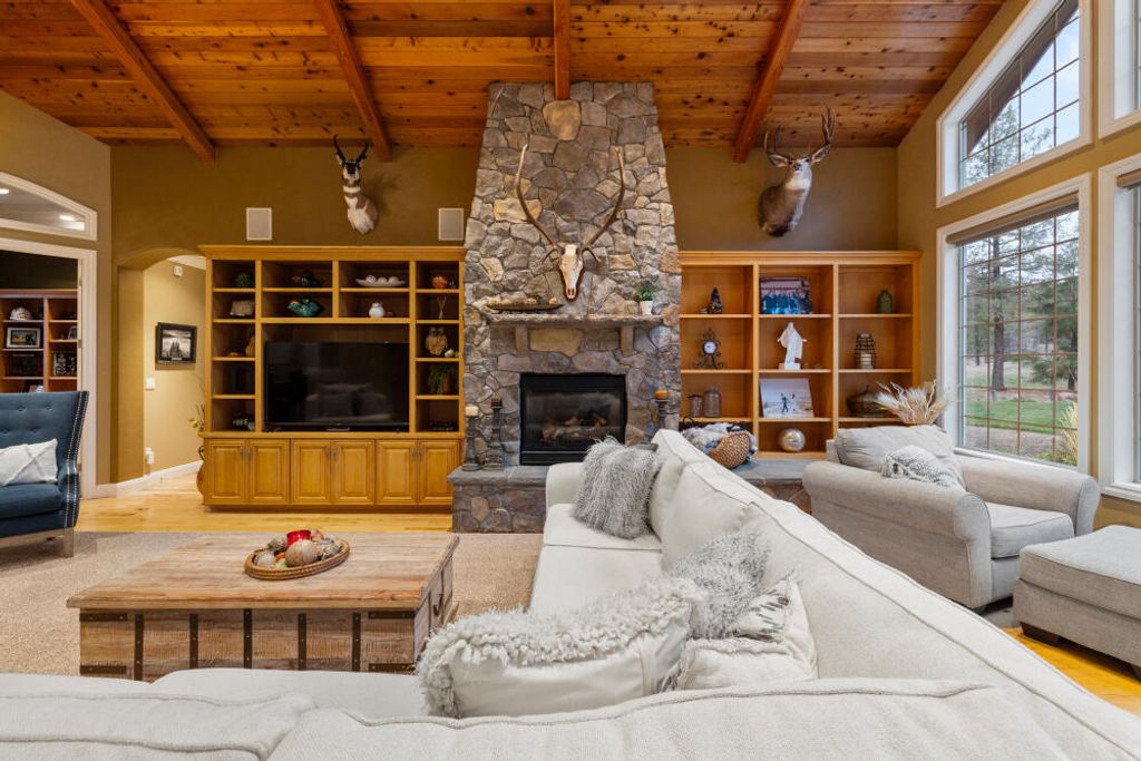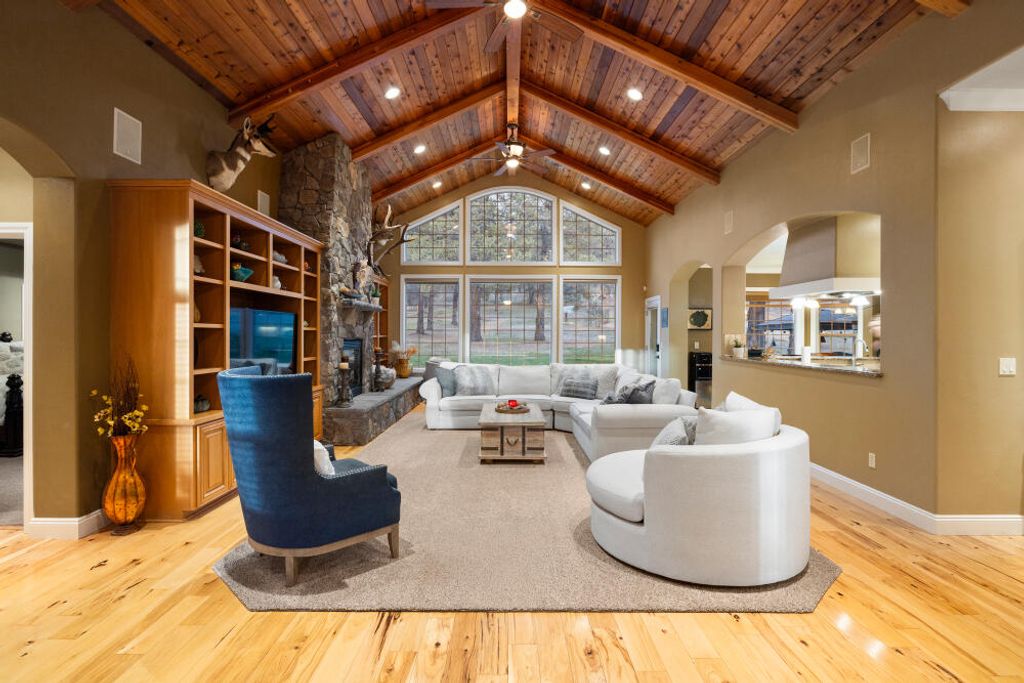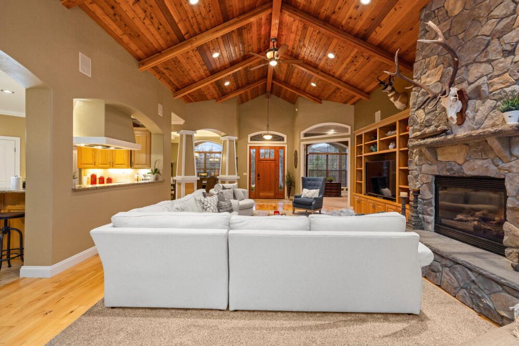 Truly one of a kind custom built home with the wow factor, in the gated community of Ridgewater! Feels like you walk into a mountain lodge, greeted with vaulted ceilings, exposed beams, wood paneling and a large masonry surrounded fireplace. The floor plan is the open great room concept and also features a nearby dining room that is open to the area, yet also separated with a few pillars to provide either separation, or still allow inclusion to the living room activities. Top of the line Wolf cook-top, oven, and Sub Zero refrigerator! The Hardwood flooring is in immaculate condition and the tile in the bathrooms and throughout the home is a sealed travertine. The den/office could easily become a 4th bedroom, and the primary suite has incredible tile finishes with a separate shower and soaking tub. Additionally there is a 3 car garage, private backyard patio, w/ covered BBQ area, and no neighbors behind to enjoy the views of the trees w/ privacy. This home is an absolute must-see!