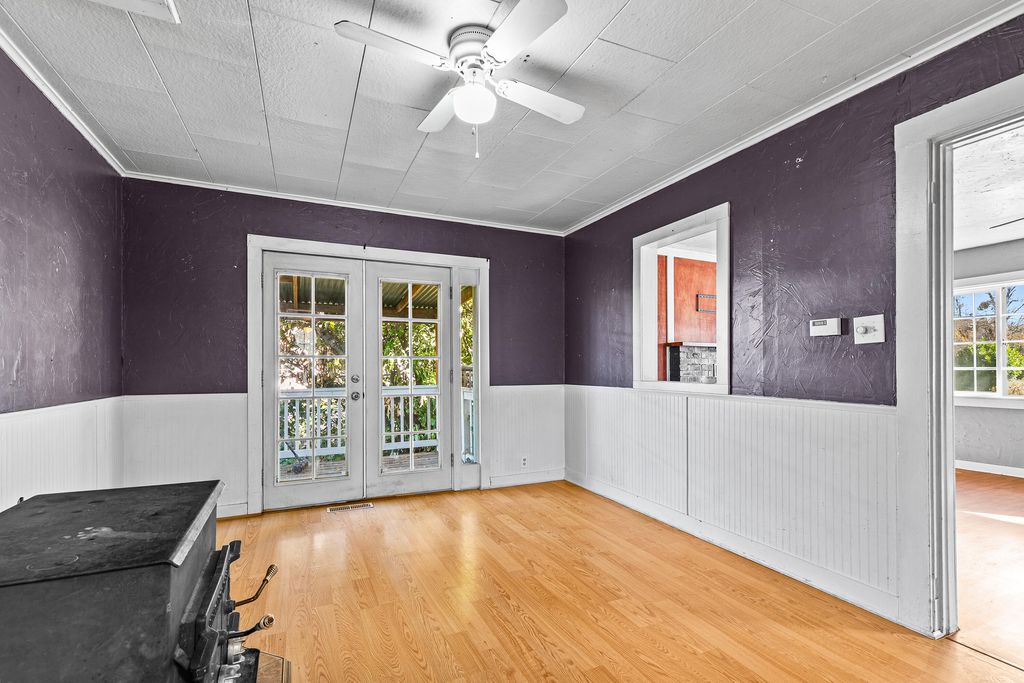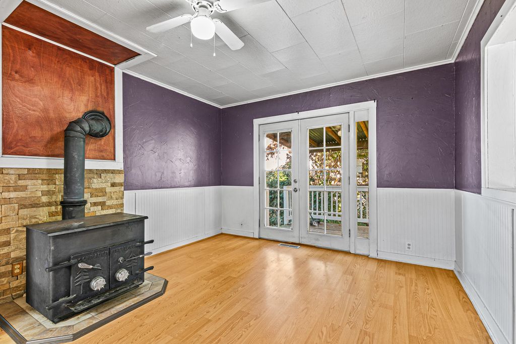 Fantastic opportunity near shopping, schools, and parks. This home sits on a big lot with a large front and back yard and has solid bones with a metal roof, wood siding, vinyl windows, and great potential. The long driveway leads to an attached single car garage ideal for storage or a small shop. Inside is a covered porch entry, tile flooring, a living room with a wood fireplace, and a dining area with a second wood stove and access to a covered side yard. The kitchen is clean with tile counters, wood cabinets, a glass top range, a stainless microwave, and added storage. Two bedrooms and a full bath sit off the hall and leads to a large third room that could be a primary suite with a walk-in closet, game room, or extra living space. The backyard is roomy and ready for upgrades. This is a great chance to update a home with real upside.