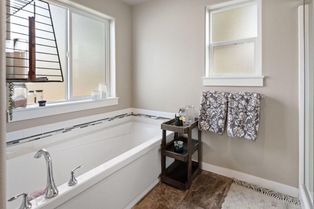 Upstairs, the primary suite enjoys mountain views, a large walk-in closet, and a spacious ensuite with soaking tub and dual vanity. Two additional bedrooms, a full bath, and a convenient laundry room complete the upper level.