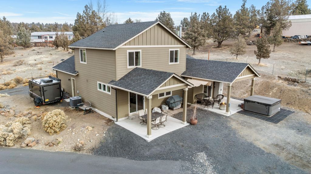 Beautiful Craftsman home in Crooked River Ranch sits on a fenced 1.12 acres. A gated, paved driveway leads you to a 1,926 sf home that boasts lots of windows. A large foyer & wide staircase welcome you into this lovely home. The main floor has a large laundry room with sink, a half bath, the primary bedroom with en suite bathroom has double sinks & a walkin closet, a livingroom with wood stove, a dining room & a kitchen. There are quartz countertops throughout & the kitchen has stainless steel appliances including a refrigerator, double oven & it has a large pantry. The second floor has a sitting room, two bedrooms, one with mountain views, & a bathroom. There are two patios off the back of the home with a hot tub off the primary bedroom's patio. There is a 200 sf insulated shed with sub panel power, heater & window AC.