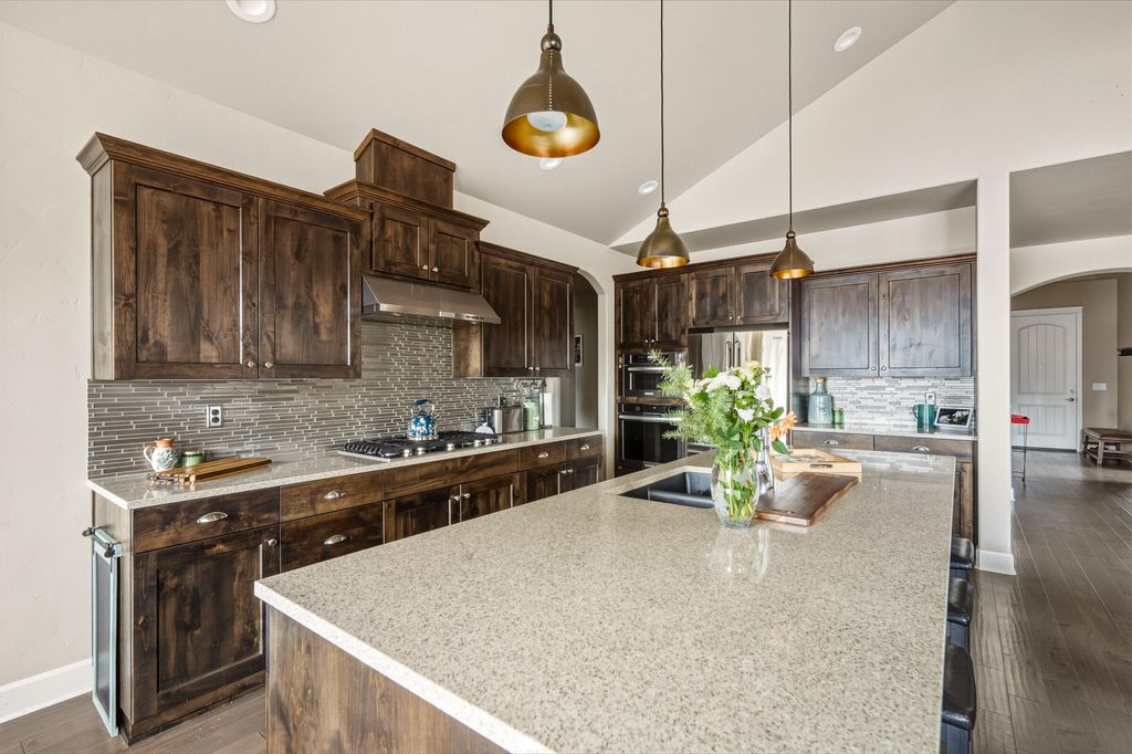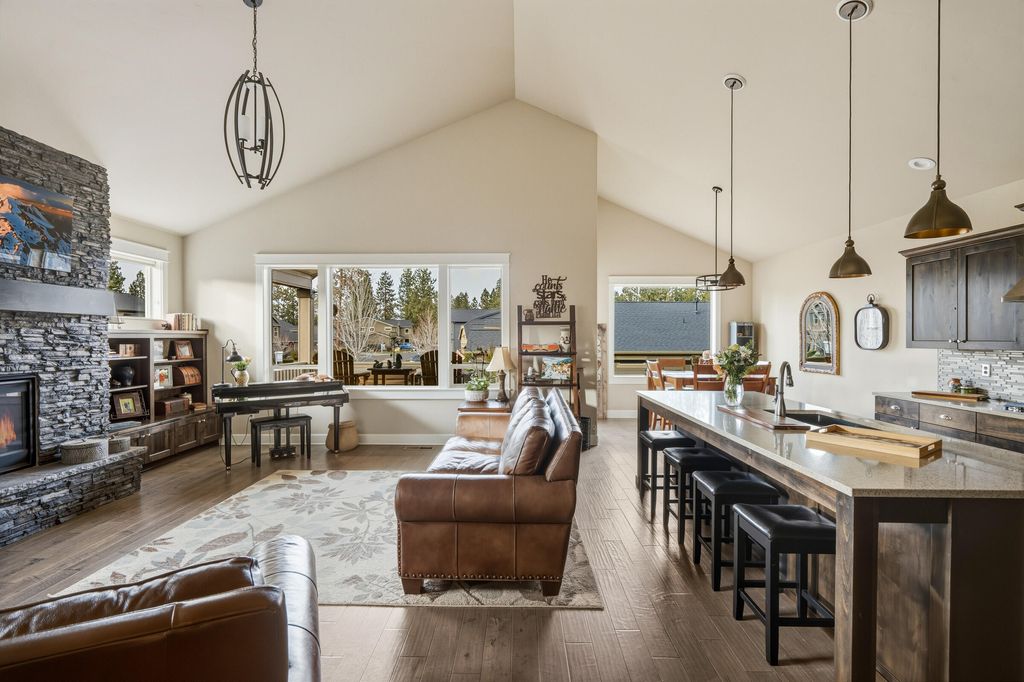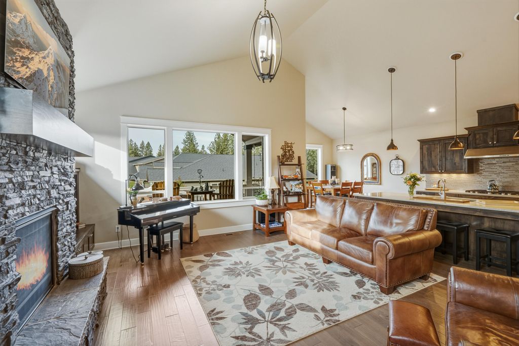 Pride of ownership is evident in this well-appointed 2,092 sq/ft single-level home on a desirable corner lot in Stonegate. Offering 3 bedrooms, 2 bathrooms, and a 3-car garage, this home features an open layout with vaulted ceilings, abundant storage and excellent bedroom separation. The spacious kitchen includes an oversized island, extra-large pantry, and flows seamlessly into the main living area. Large windows fill the home with natural light, while the covered Trex deck extends the living space outdoors. The 3-car garage allows for extra storage and a workspace. Quality finishes include a stacked stone fireplace, solid surface counters, tile showers, stunning cabinetry and millwork, and designer light fixtures. Enjoy the community trail, pool, and playground, with easy access to the highway, shopping, schools, and public land. This wonderful SE Bend property is the complete package for any lifestyle! Front and sideyard landscaping covered by HOA.