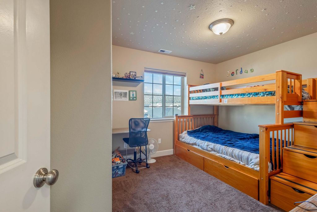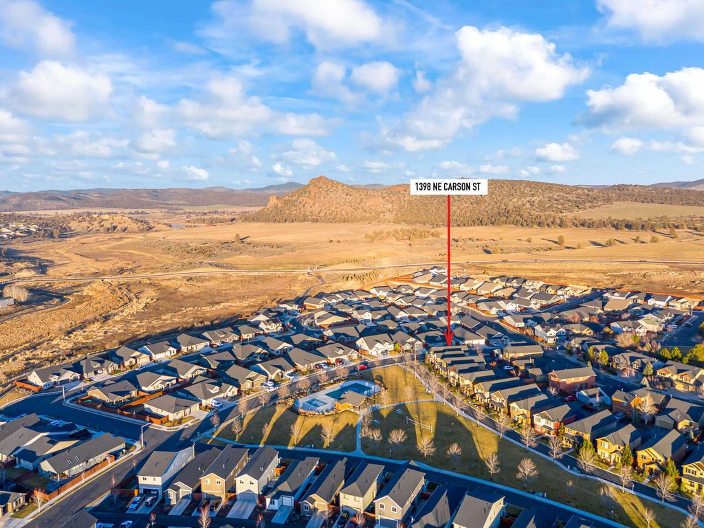 Gaze upon Barnes Butte from this corner lot home! There is an easy maintenance side yard and the HOA maintains the front yard. Green space is just across the quiet street. This home features an entry area, gas fireplace, pantry in the kitchen, and has an upstairs bonus area with an office nook. The primary bedroom includes a window seat, walk in closet, and has double sinks and a skylight in the bathroom. The laundry room is conveniently located upstairs as well. Two guest rooms and a full bathroom, also with double sinks, complete the upstairs. A utility sink in the garage makes cleanup easy! Community features include a playground, walking paths, pool, and basketball court. 30 minutes to the regional airport in Redmond and 50 minutes to Bend.
