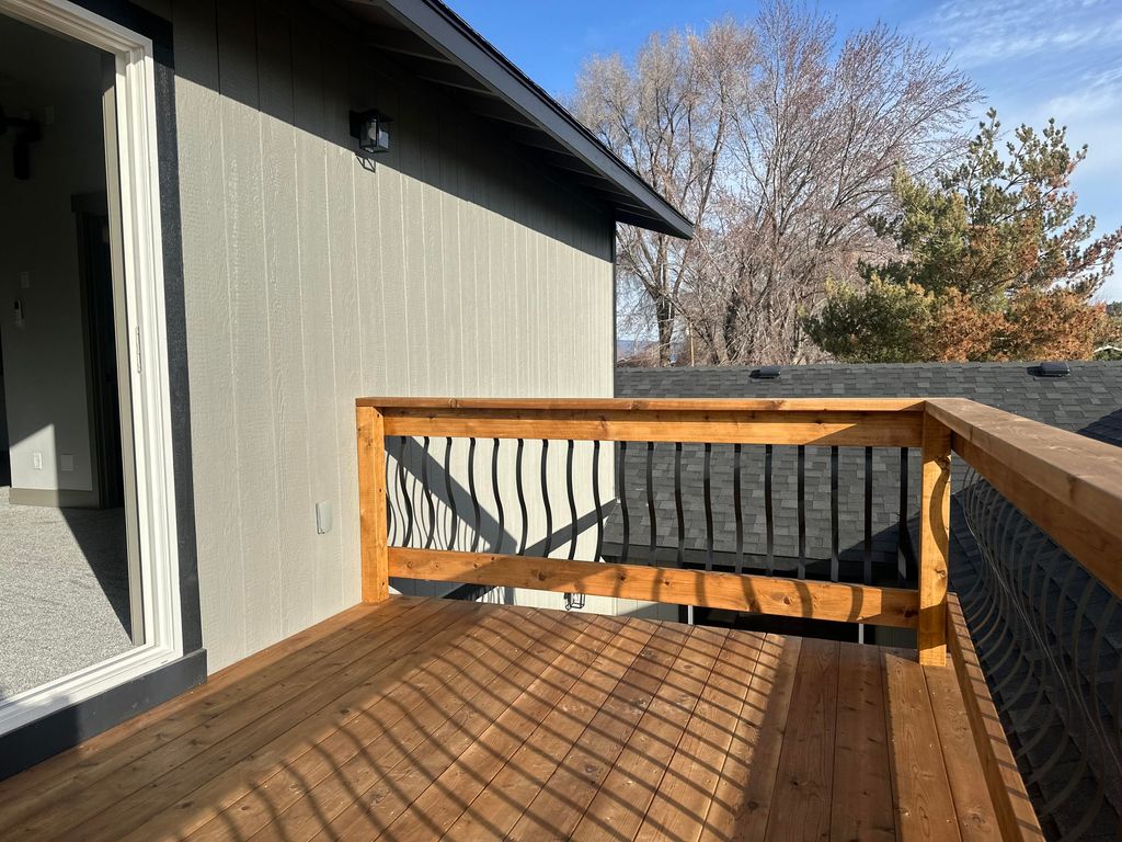 Completely remodeled, 2621 sf home in town, with RV parking, shines with a versatile layout, ideal for multi-generational living. The entire upstairs, complete with a gas fireplace, would make a wonderful studio-style living space for family or guests. . This updated home features 2 primary suites, two additional bedrooms, and three full bathrooms. Extensive upgrades include new roof, HVAC system, insulation, windows, doors, interior/exterior paint, custom cabinets, LVP flooring and new appliances. The chef's kitchen offers leathered granite countertops, gas cooktop and double ovens, with one featuring convection, microwave and air fryer. Circulating hot water heater adds comfort and efficiency. Both primary suites (one upstairs and one on the main level) feature their own private deck. This 'better than new' home is situated on a fully fenced, 1/4 acre lot in an established neighborhood close to shopping, schools, restaurants and amenities.