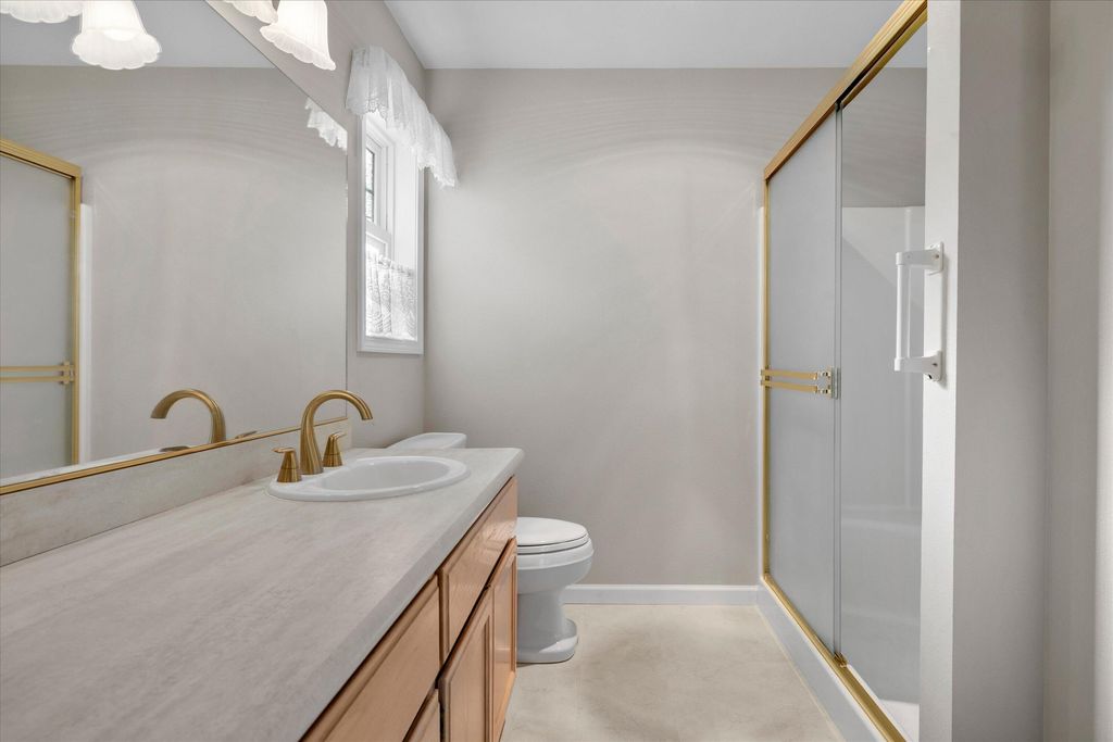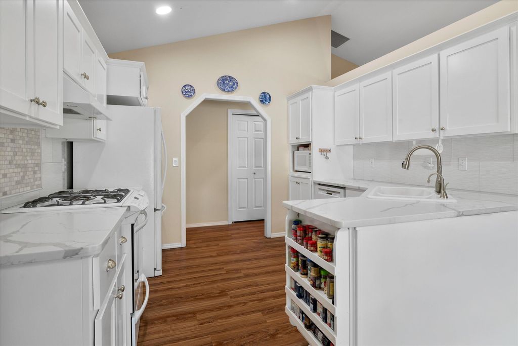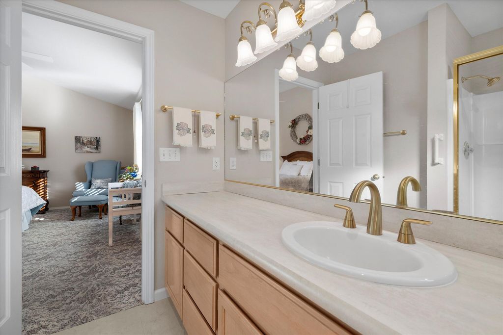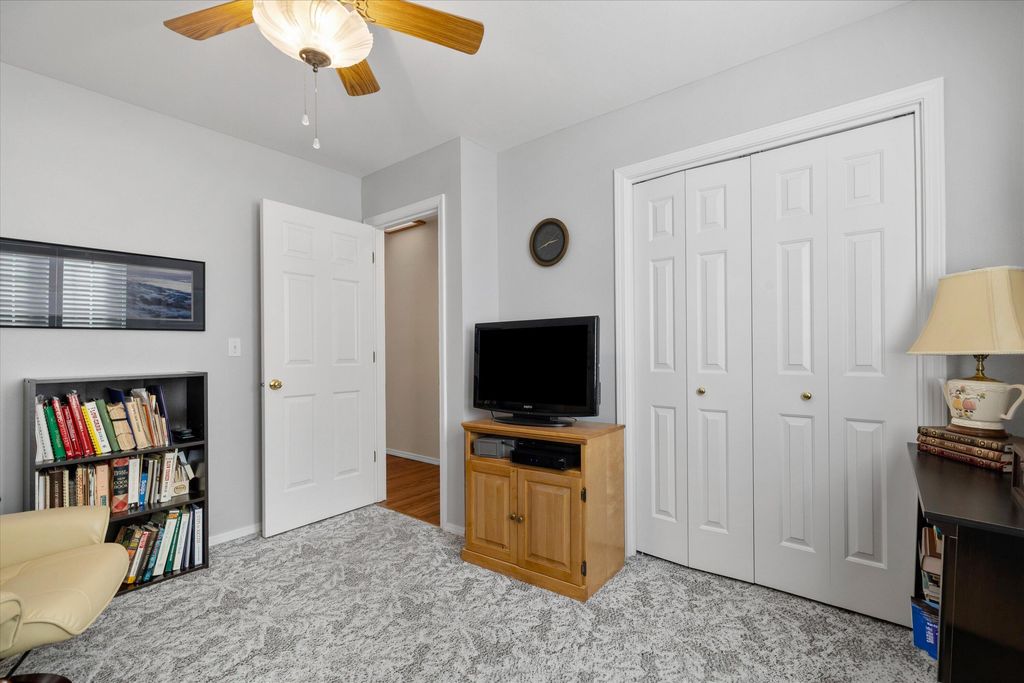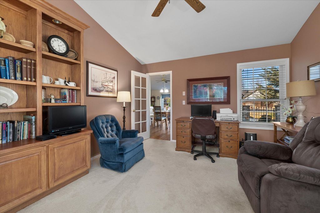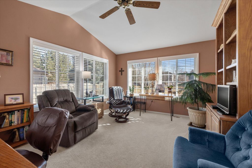 Recent updates include a remodeled kitchen and bathrooms, new windows throughout, exterior paint, newer furnace, A/C unit, and water heater. The inviting living room features vaulted ceilings and a cozy gas fireplace. The main-level primary suite offers vaulted ceilings and a walk-in closet. In addition to three bedrooms, the home includes a generous office/den currently used as a second living area, providing flexible space to fit your needs. Stonebrook is known for its beautifully maintained common areas, ponds, and water features, creating a serene, park-like setting that truly sets this neighborhood apart.