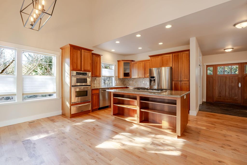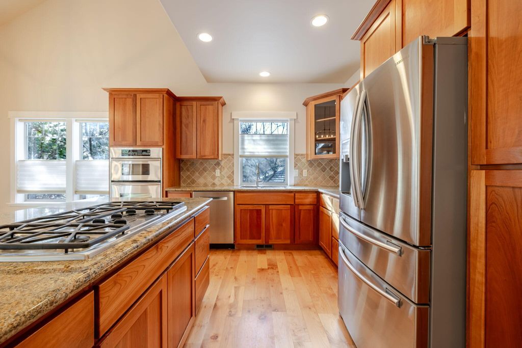appliances, an island, ample storage, and a wine fridge for unwinding by the fireplace.