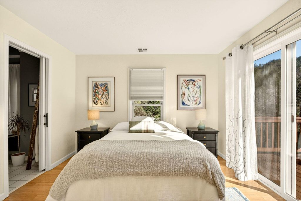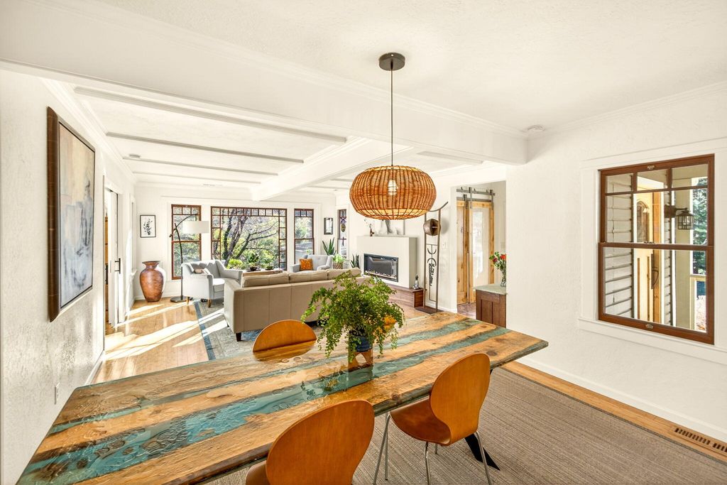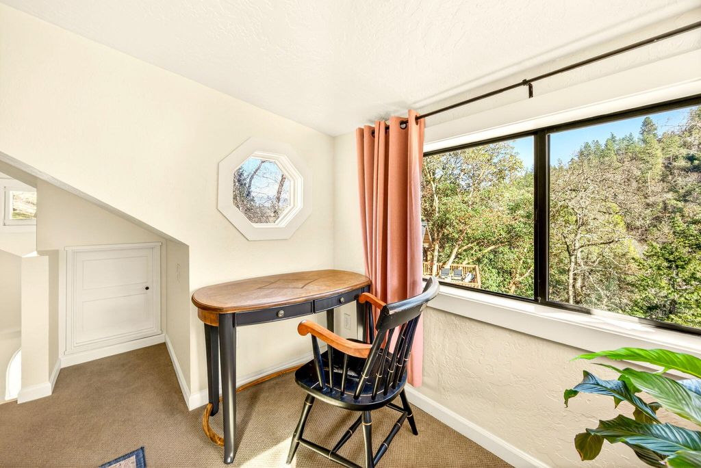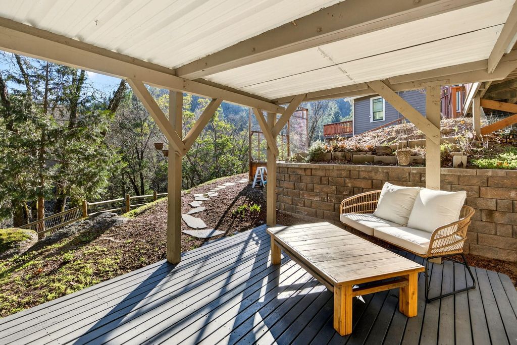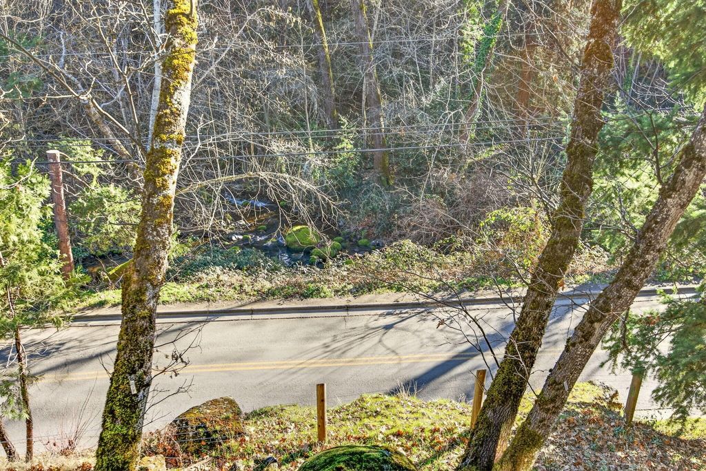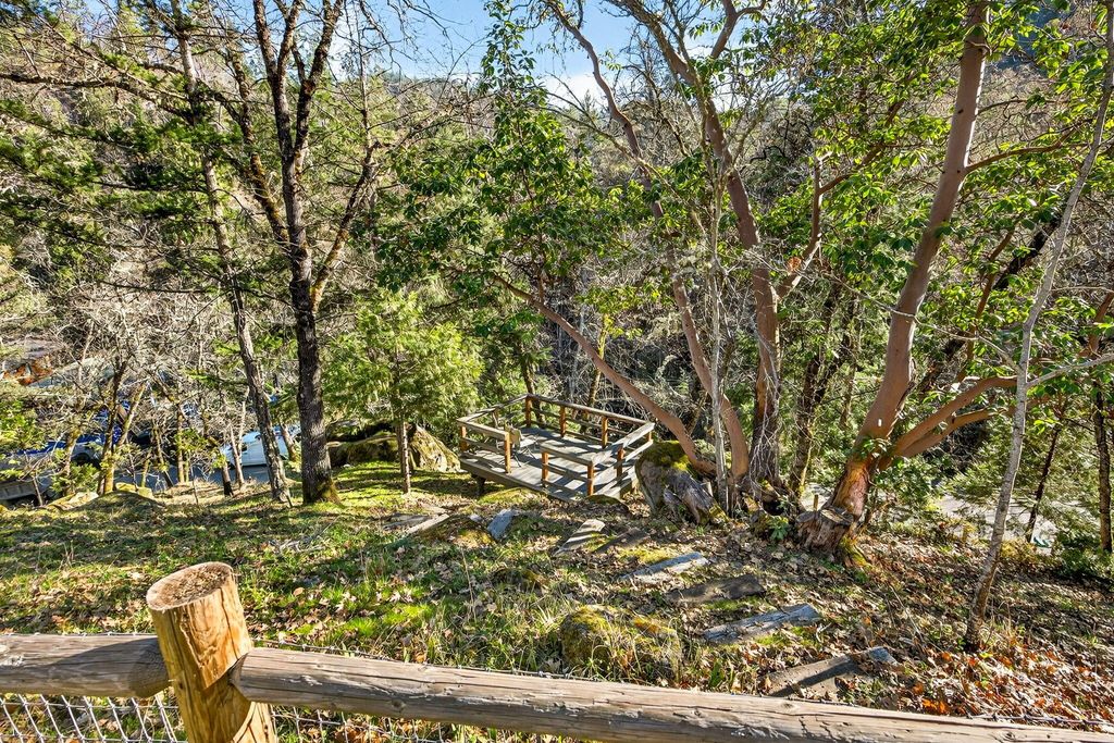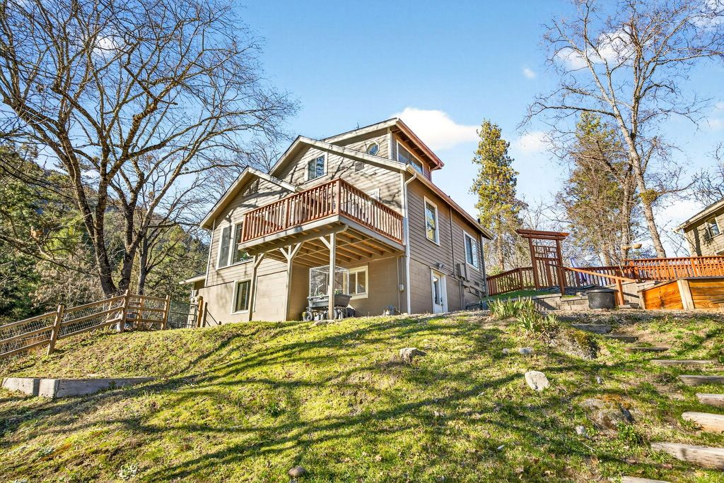 Set just steps from Lithia Park, this mid-century property spans over an acre across 3 tax lots. The light-filled main level features a living room with bamboo flooring, a coffered ceiling, and an electric fireplace. The kitchen includes thoughtful updates and a cozy breakfast nook, while the primary bedroom offers an ensuite bath with a classic clawfoot tub. Upstairs, a 2nd bedroom is paired with a half bath. The lower level provides excellent flexibility with a rec room that can serve as a 3rd bedroom or private in-law suite, complete with a wet bar, wine fridge, full bath with walk-in shower, and its own exterior access. A detached guest house adds further versatility with a kitchenette, full bath, loft, and a lower-level home gym. Three separate decks invite you to take in treetop views and the sights and sounds of Ashland Creek. The fully fenced yard offers space for gardening, pets, or small animals, along with raised beds and views of Grizzly Peak and the Ashland Creek canyon.