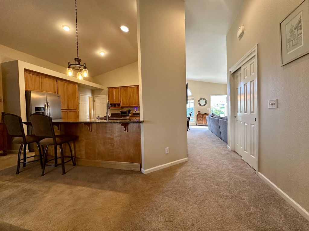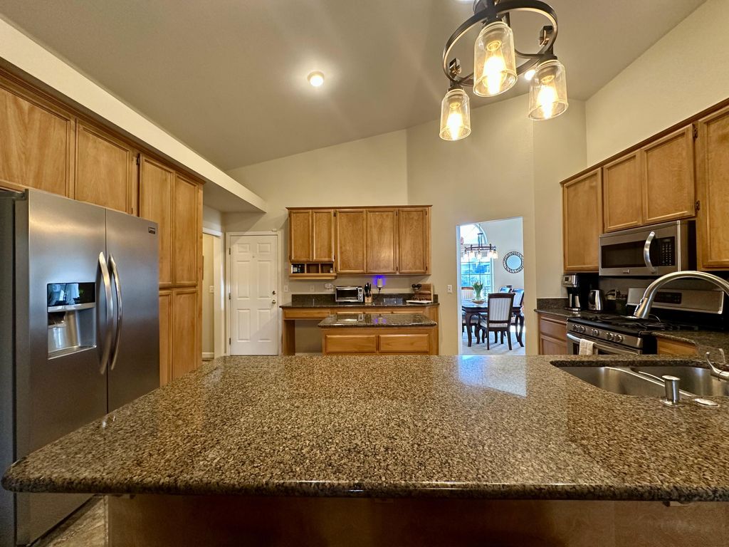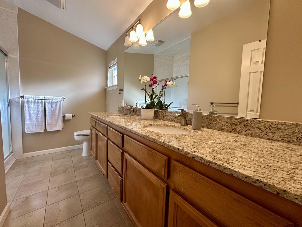 The spacious kitchen features abundant cabinetry, generous counter space, granite countertops, and tile flooring, making it both beautiful and practical for daily living. Both bathrooms offer clean, timeless tile finishes.