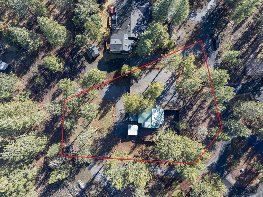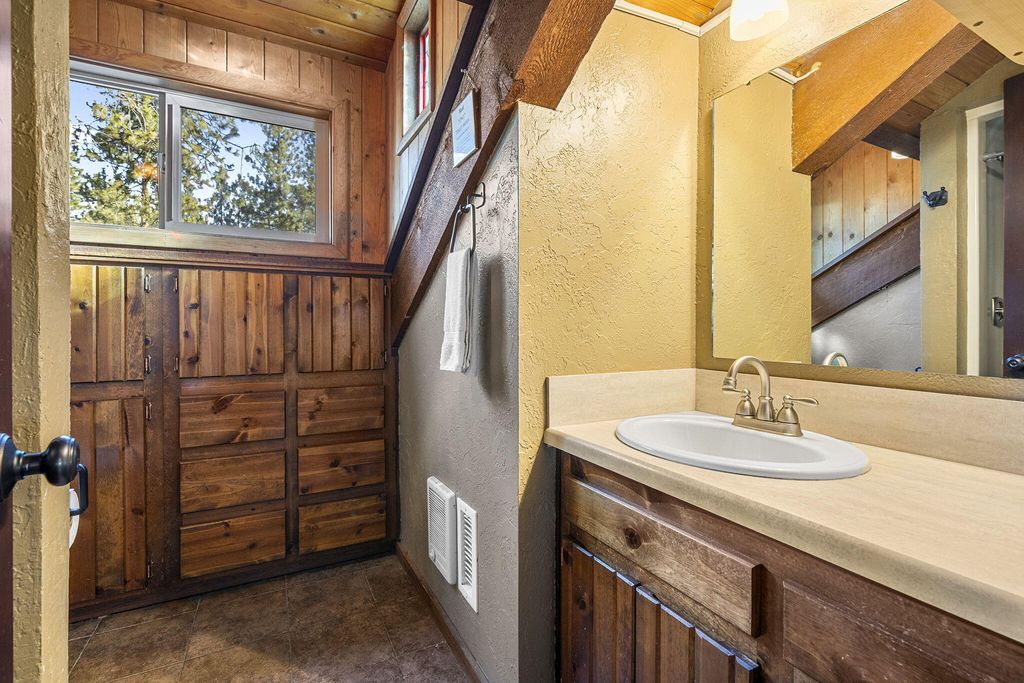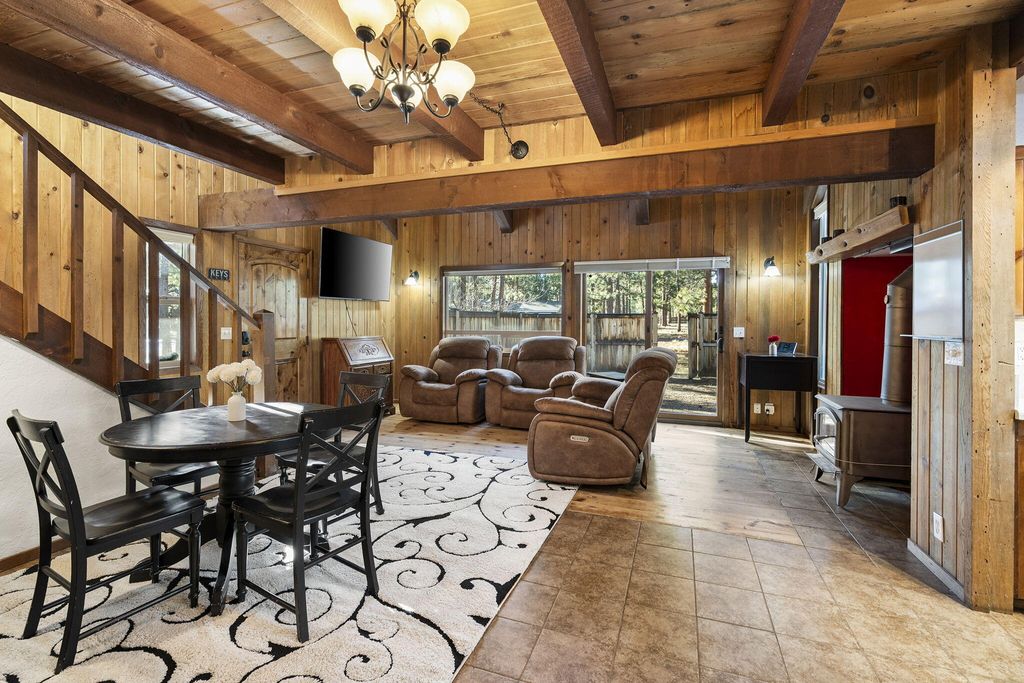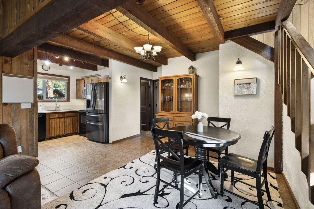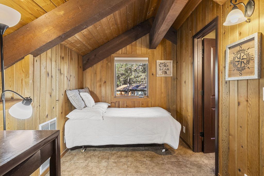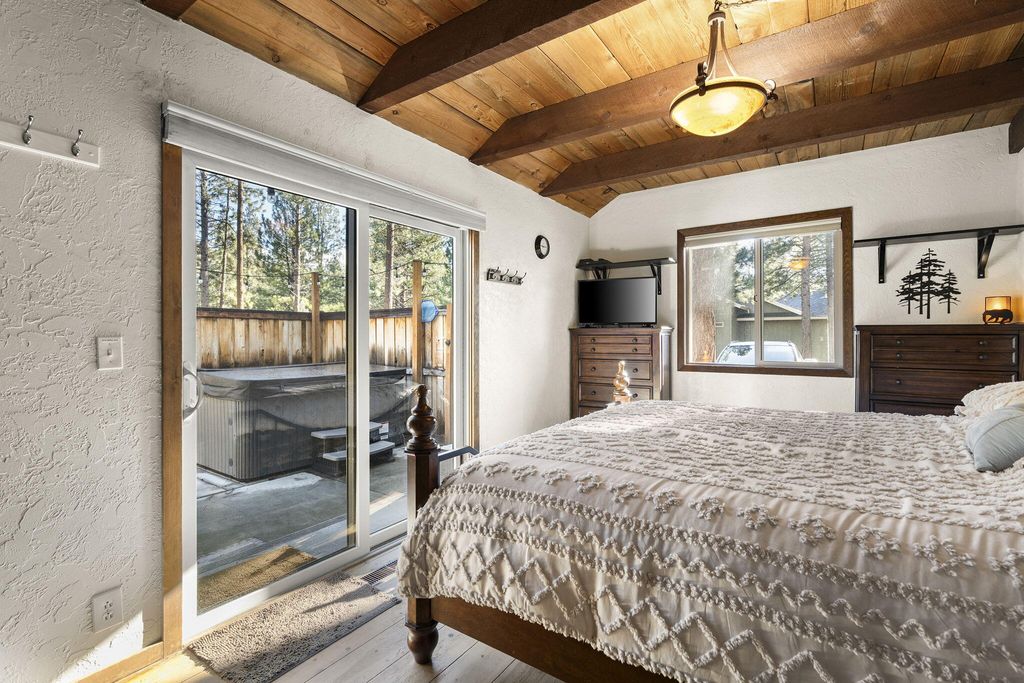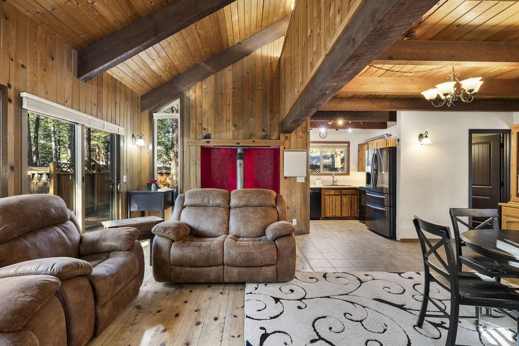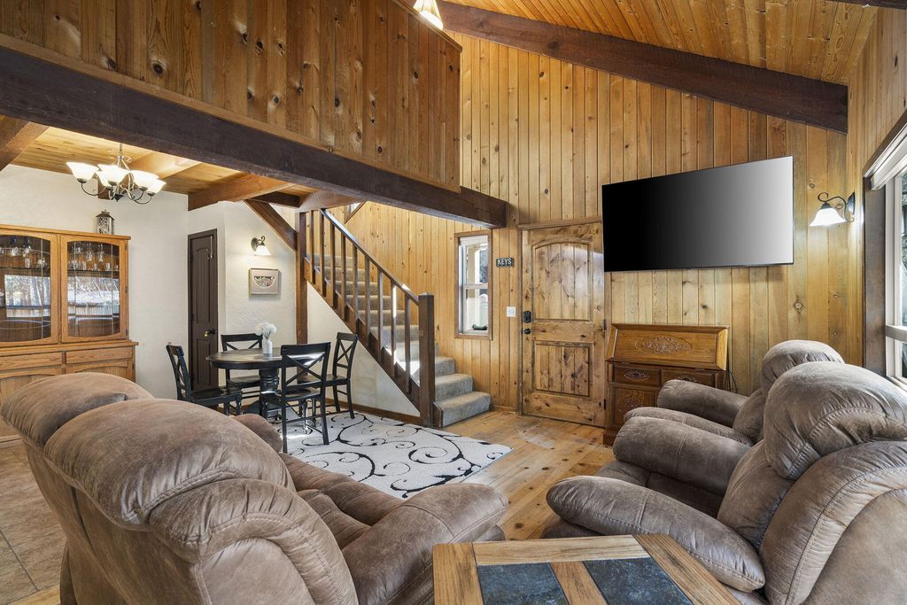 Charming cabin on a 1/2 acre lot featuring an inviting open floor plan, soaring beamed ceilings, and a cozy wood stove. The home offers a bedroom and full bath on each level, providing flexibility and comfort. Enjoy multiple outdoor entertaining spaces, including expansive decks, paver patio & hot tub perfect for gathering and relaxing.