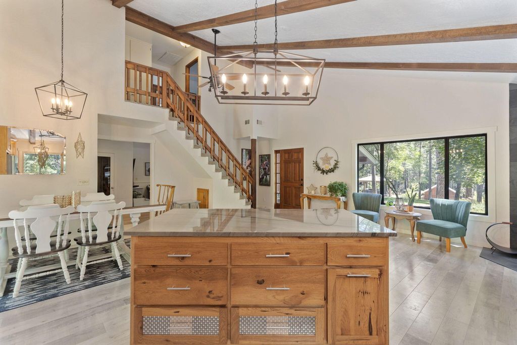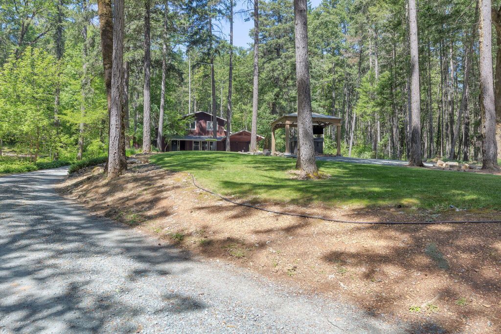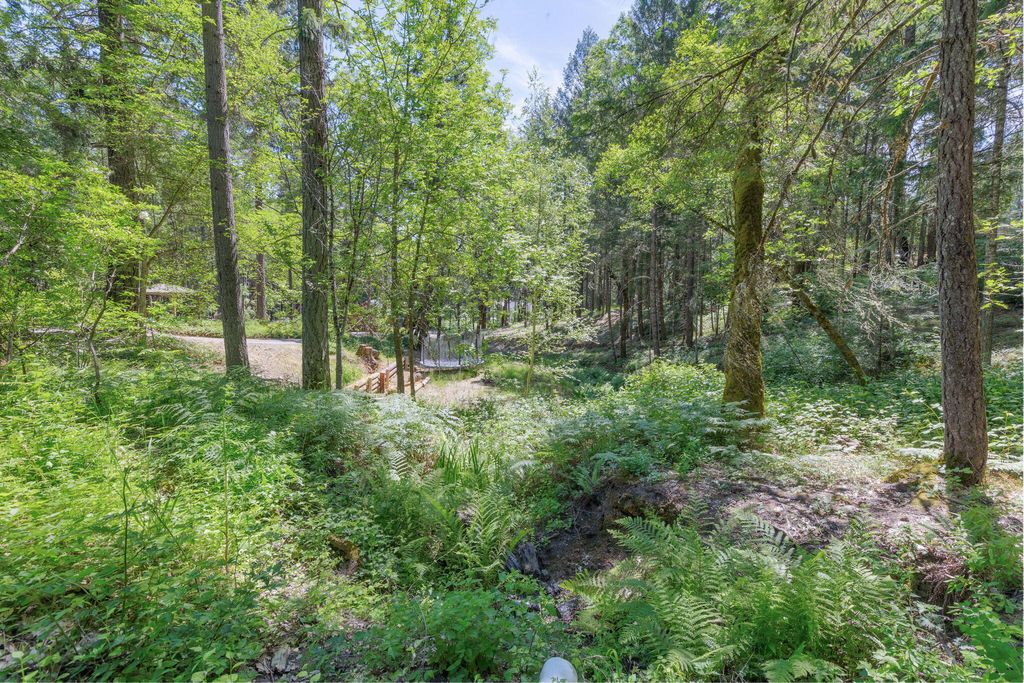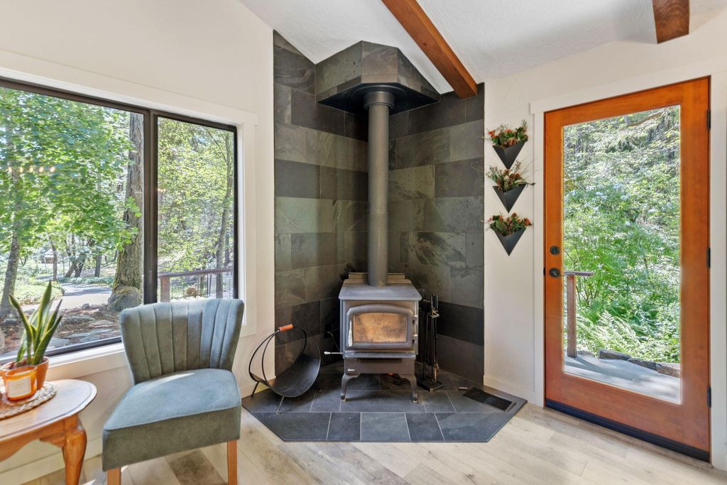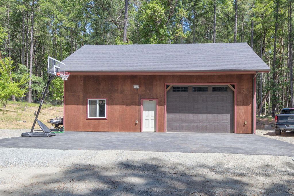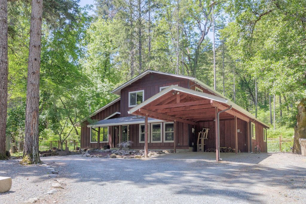 A private retreat is set on 3.25 wooded, semi-private acres where comfort, flexibility, and lifestyle come together. This custom 2,140 SF home features an open floor plan with soaring vaulted ceilings that create an airy feel throughout. Updates include a beautifully remodeled kitchen with Quartzite countertops, hickory cabinets, and stainless steel appliances, along with new carpet, travertine tile, and laminate flooring. A cozy wood stove capable of heating the entire home anchors the living space, perfect for cool Southern Oregon evenings. Upstairs, the spacious primary bedroom offers privacy and an ensuite full bath. What truly sets this property apart is the massive 40x40 shop, complete with an enclosed bedroom, full bathroom, and upstairs storage, ideal for hobbies, guests, multi-generation living, or potential two-family setup. RV parking with hookups adds even more versatility. Enjoy natural landscaping, including plum and fig trees. This is not just a home, it's a lifestyle.