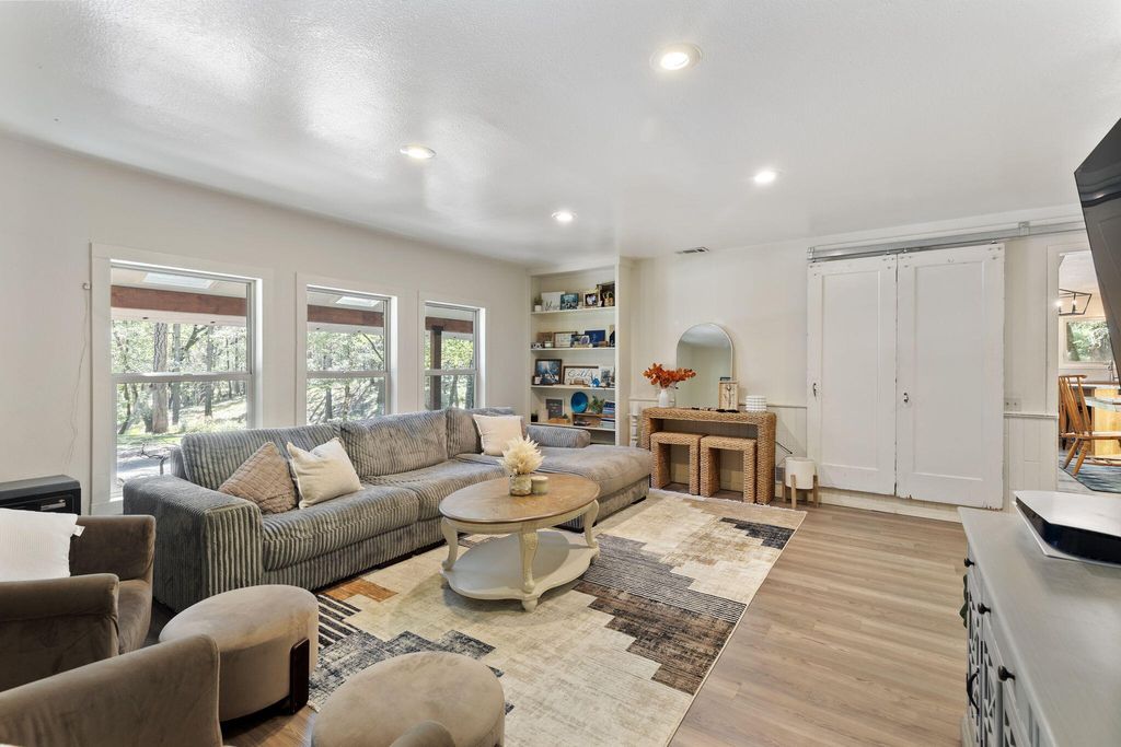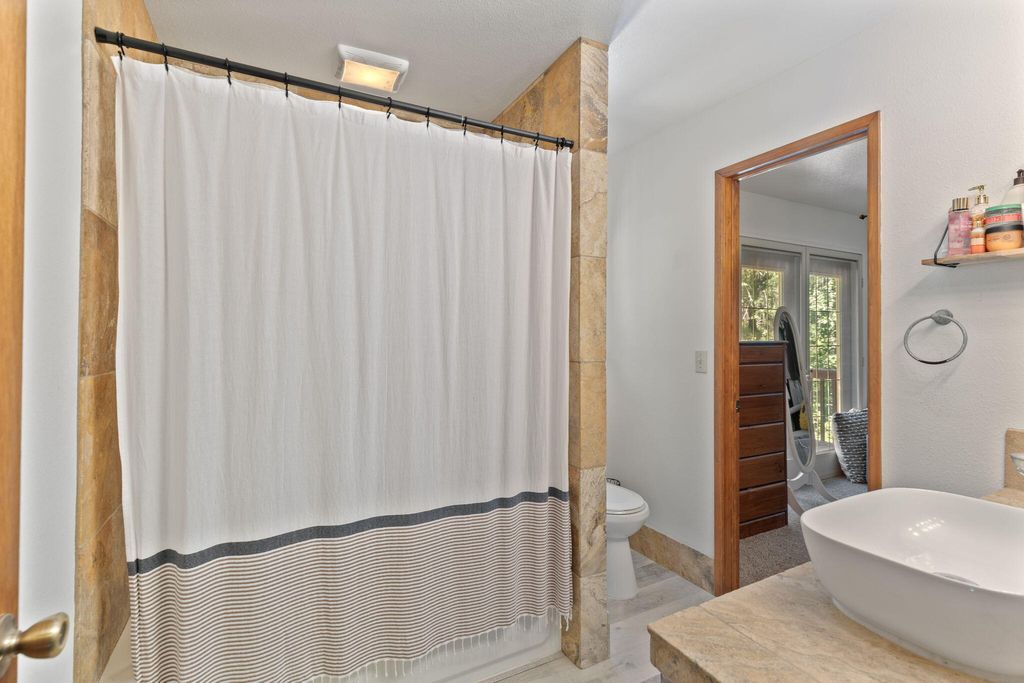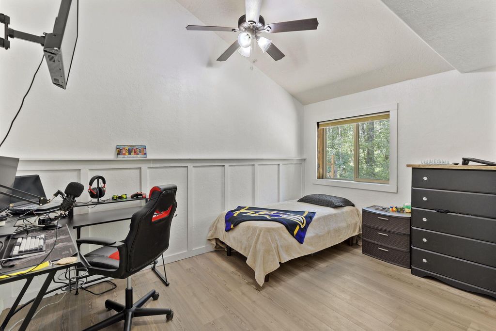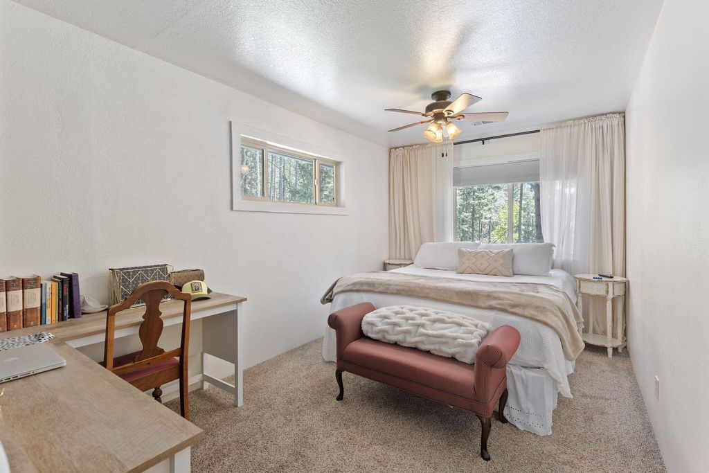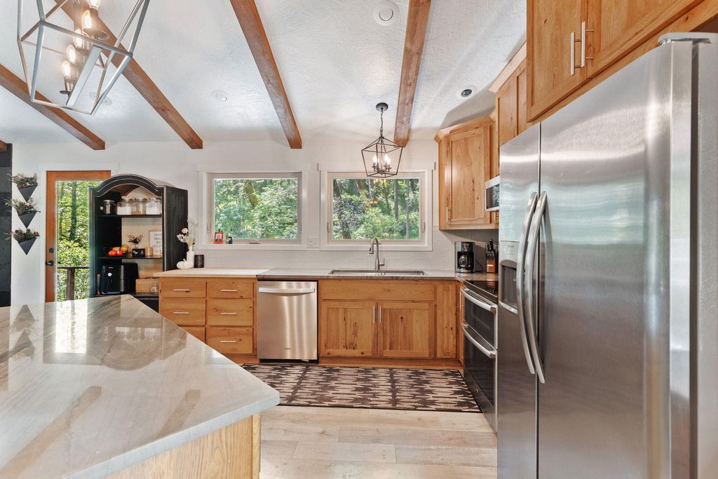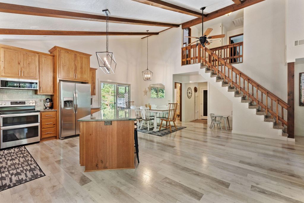 A private retreat is set on 3.25 wooded, semi-private acres where comfort, flexibility, and lifestyle come together. This custom 2,140 SF home features an open floor plan with soaring vaulted ceilings that create an airy feel throughout. Updates include a beautifully remodeled kitchen with Quartzite countertops, hickory cabinets, and stainless steel appliances, along with new carpet, travertine tile, and laminate flooring. A cozy wood stove capable of heating the entire home anchors the living space, perfect for cool Southern Oregon evenings. Upstairs, the spacious primary bedroom offers privacy and an ensuite full bath. What truly sets this property apart is the massive 40x40 shop, complete with an enclosed bedroom, full bathroom, and upstairs storage, ideal for hobbies, guests, multi-generation living, or potential two-family setup. RV parking with hookups adds even more versatility. Enjoy natural landscaping, including plum and fig trees. This is not just a home, it's a lifestyle.