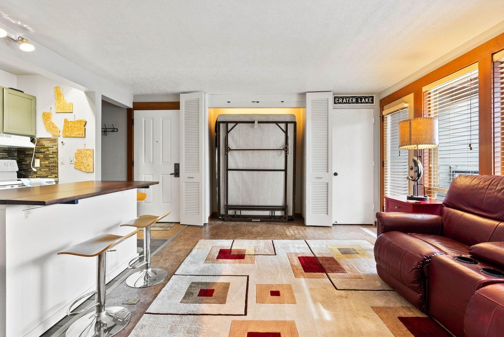 Great opportunity to get into a one bed, two bath unit at Inn of the 7th Mtn resort. Easy living unit with a murphy bed in the living room and it's own bathroom. The bedroom has an ensuite bathroom and can be locked so the units can be rented separately. Live, rent, or put it into the rental pool! Easy access to Mt Bachelor, mountain biking, and the Deschutes River. Enjoy heated pools, hot tubs, fitness center, pickleball, tennis, disc golf, seasonal ice rink, on-site dining, and year-round recreation just 15 minutes to Mt. Bachelor and 10 minutes to downtown Bend. Everything is included in the HOA: water, sewer, garbage, basic cable, phone, WIFI, gas, electric, heating, cooling, exterior maintenance, 24 hour security and landscaping. This is a pet friendly resort and is being sold fully furnished!