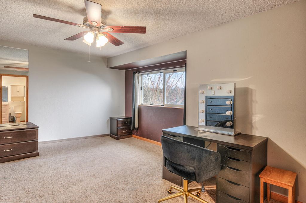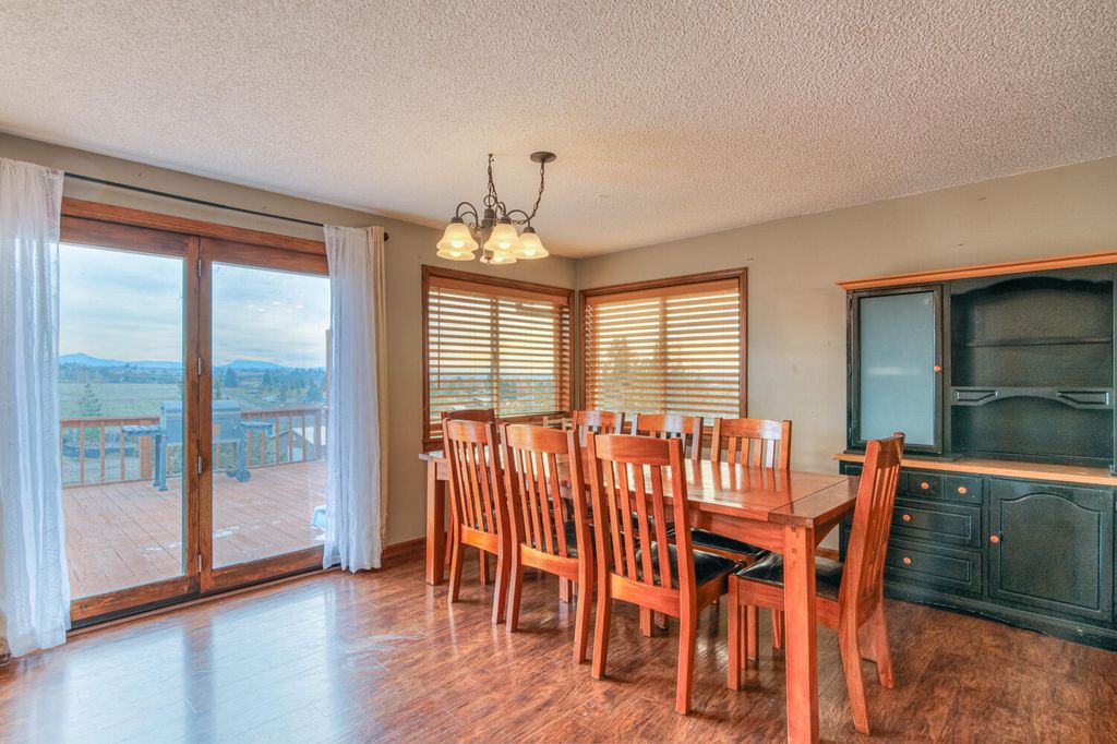 surface counters. Downstairs, the seller completed a basement remodel w/new flooring & a dedicated office, ideal for work or hobbies w/a pellet stove for heating. Outside, the oversized deck is the perfect place to grill, gather & take in the open sky & mountain backdrop. Fenced land gives room to spread out, garden & enjoy. Major updates include roof replaced in 2019, newer water heater & a recently updated electric forced air furnace & heat pump. Storage shed. A hard to find blend of land & views