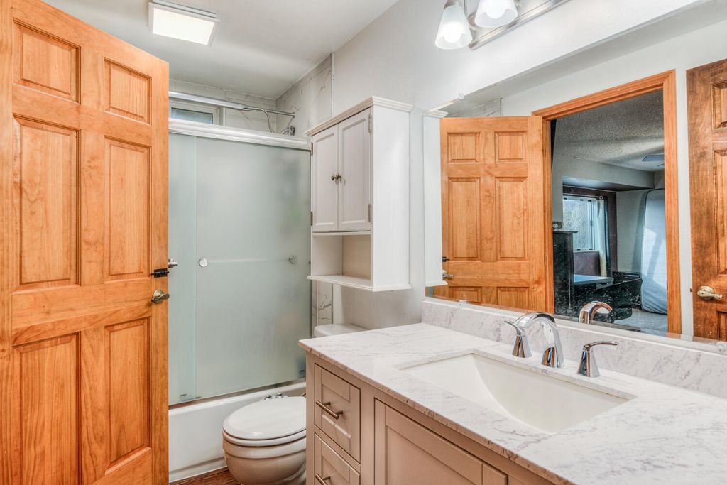 while large windows pull in natural light & frame beautiful Cascade Mountains views. Upstairs, refreshed bathrooms feature tile surrounds & new vanities w/solid