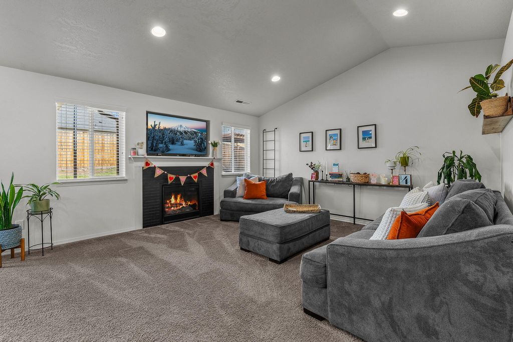 The main living area flows seamlessly between the living room, dining space, and kitchen. Large windows fill the home with natural light, highlighting the warm finishes and cozy atmosphere throughout.