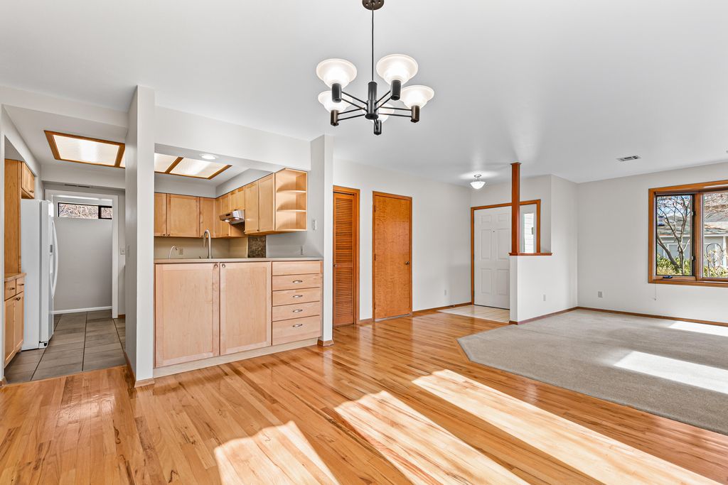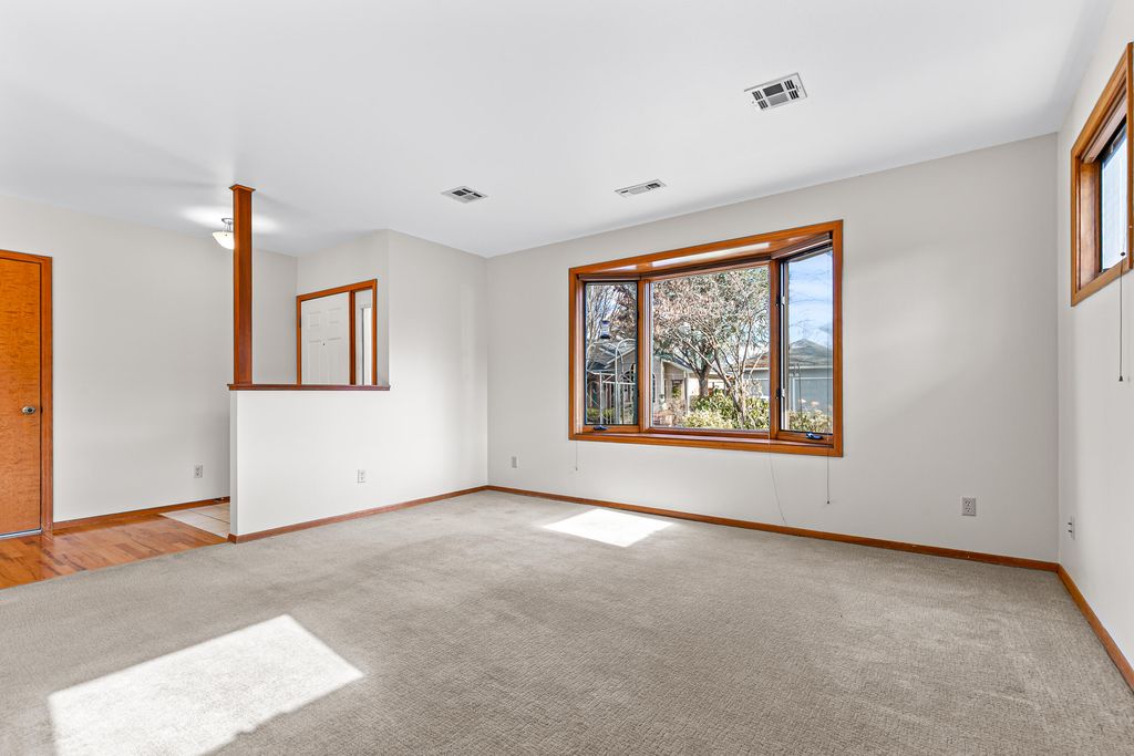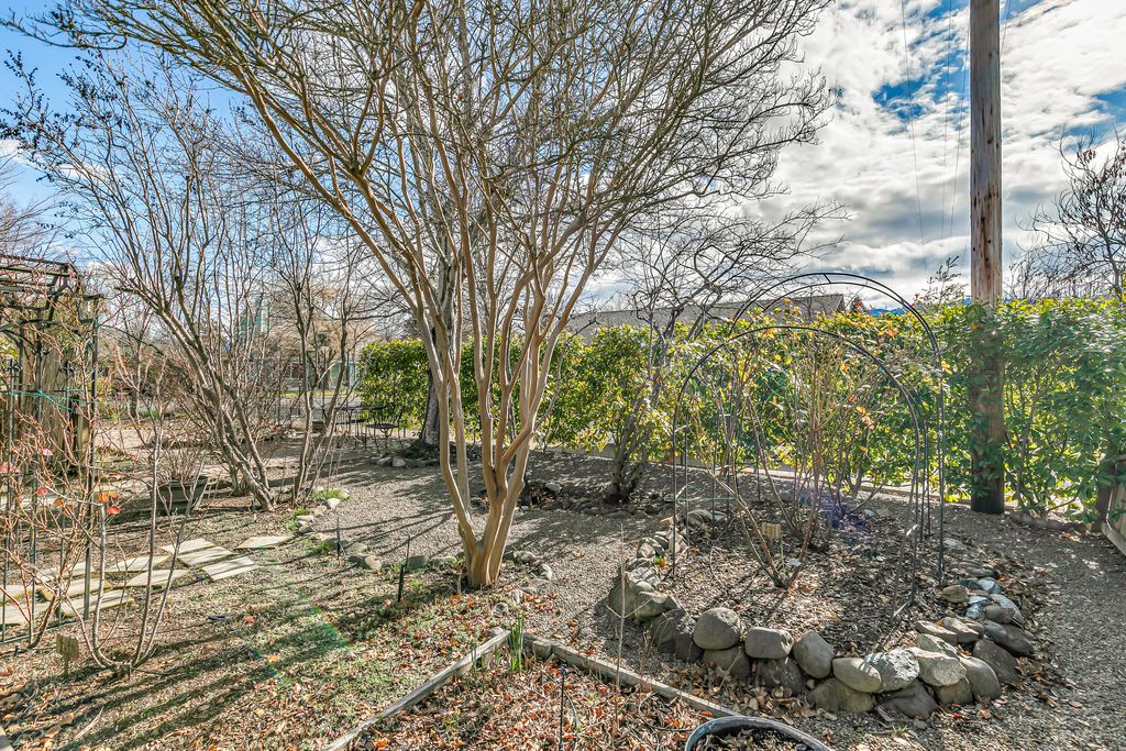 Nicely maintained single-level home on a corner lot with ornamental trees and mature plantings in the desirable Mill Pond neighborhood, located within a flat 10-minute walk to the Rogue Valley Grower's Market! Abundant natural light and air flow with operable wood-wrapped casement windows, kitchen with walk-in pantry, quartz counters, cabinets with solid wood interiors, stainless induction range with hood, dishwasher, refrigerator with ice maker, dining area with hardwood flooring and French door to concrete patio with retractable awning. Spacious primary bedroom with pocket door to full ensuite bathroom with updated quartz vanity, shower, walk-in closet, and exterior door to deck. Second bedroom closet and new carpet; full guest bath with tub shower. Updated LED fixtures and fresh interior paint. One-car garage with washer dryer hookups, utility sink, and storage cabinets. Numerous flowering bulbs and perennials, plus a garden storage shed. Inquire for details!