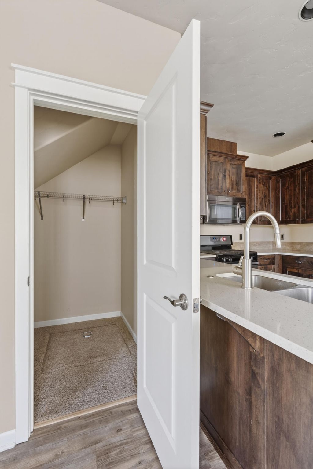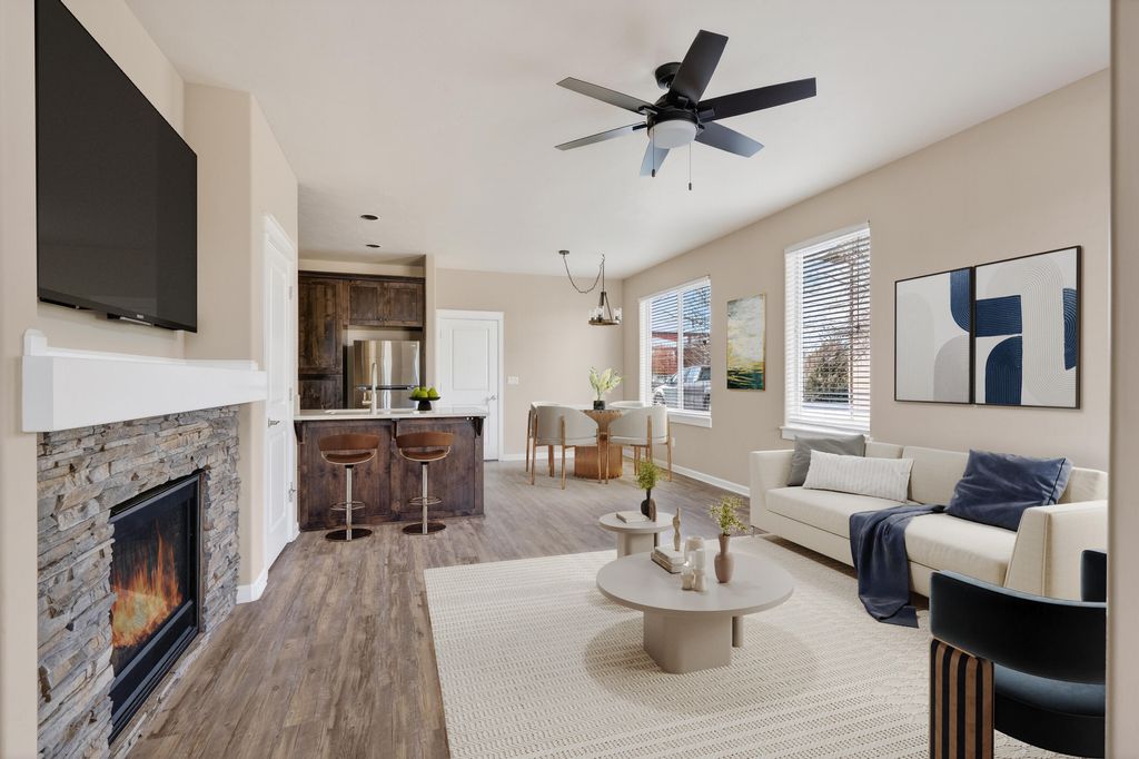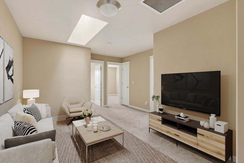 and expansive walk-in closet. Tall ceilings, oversized windows, and skylight create a bright, airy atmosphere. Other features include stacked-stone gas fireplace, quartz counters, LVP flooring, under stair storage, and extended 2-car garage. Truly move-in ready with newer fridge, paint, and carpet. A clean pre-listing home inspection offers peace of mind. Tucked