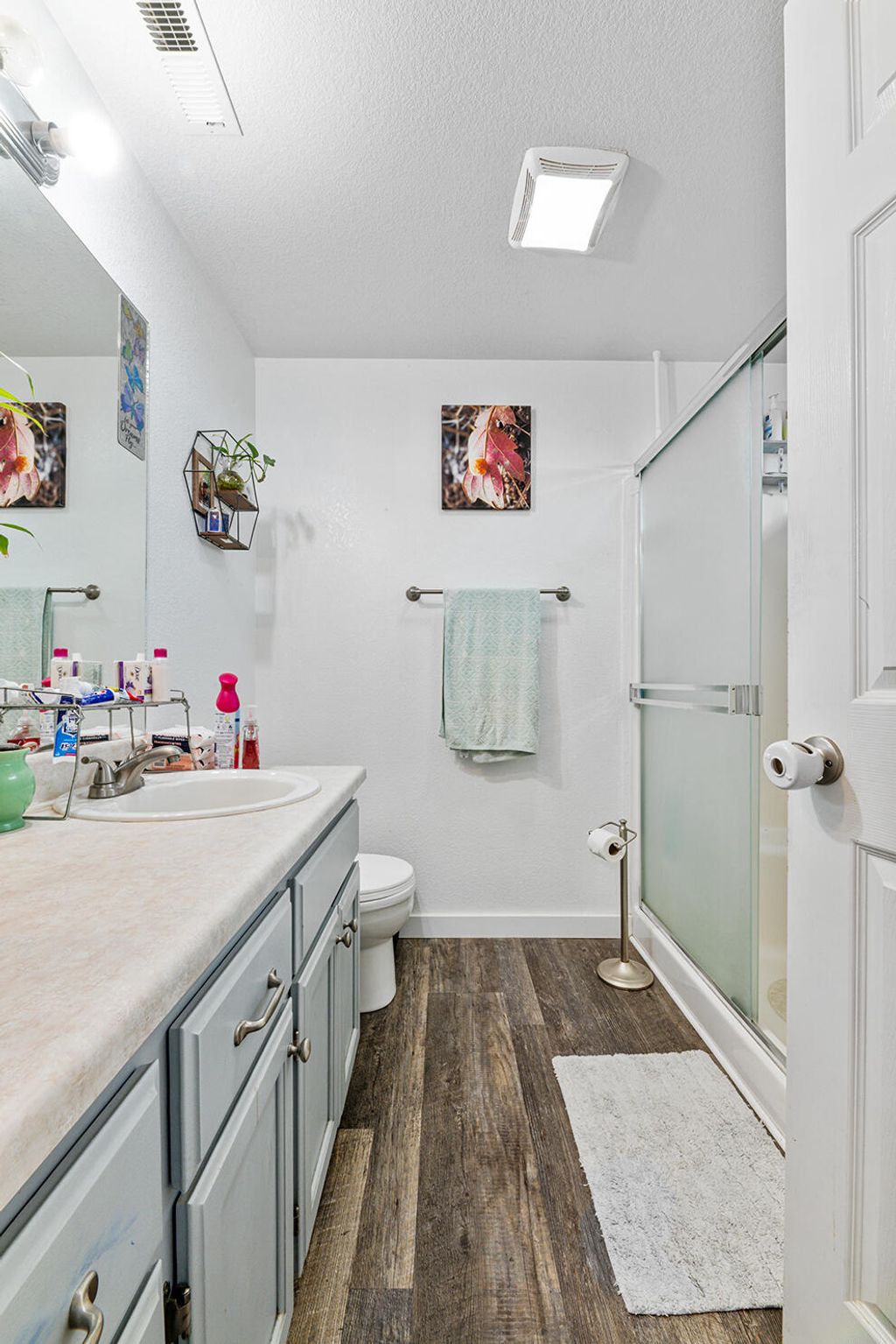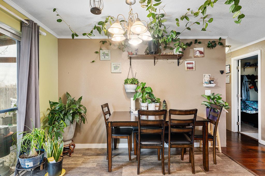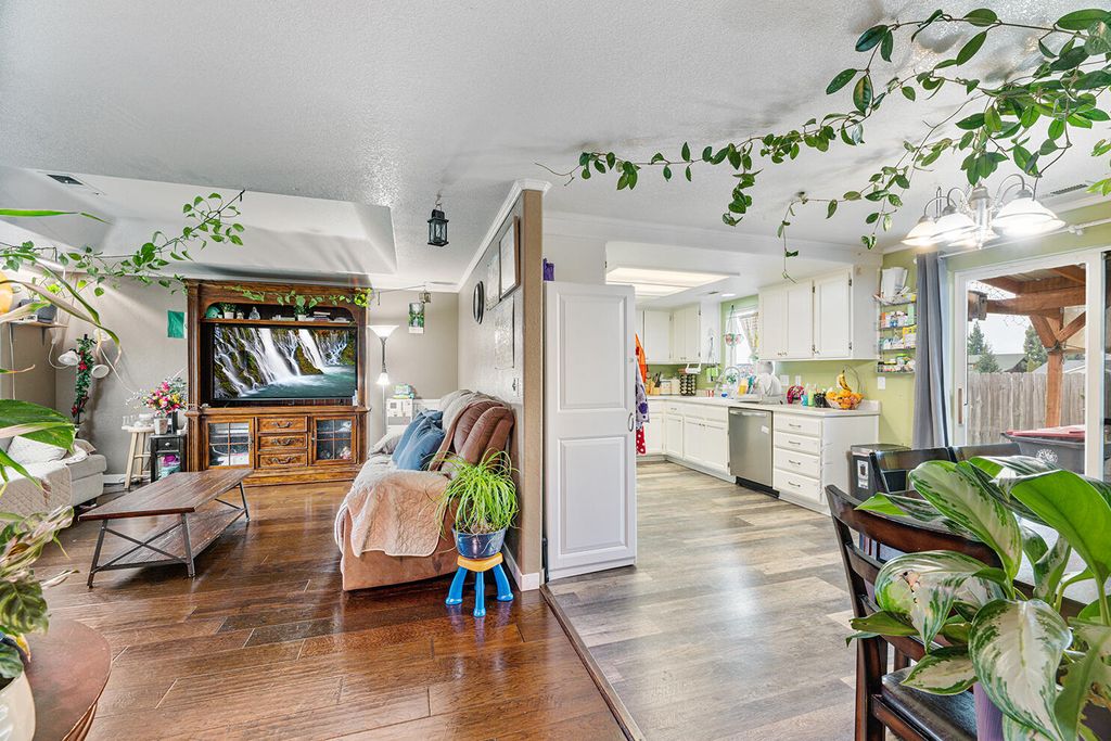 Built in 2002 and well maintained, this single-level 1,270 SF home offers 3 bedrooms and 2 baths on a lightly traveled street. The inviting living room features a coffered ceiling and large front-facing window for great natural light. The dining area opens to the backyard and flows into the kitchen with stainless steel appliances (2019) and updated flooring. The spacious primary suite includes a walk-in closet, private bath, and ceiling fan. Two guest bedrooms, full guest bath, and laundry room complete the functional layout. Fully fenced front yard with covered porch, flower beds, cherry tree, and room to play. Backyard offers a covered patio, lawn, and side-yard gates. Attached 2-car garage, trailer/small RV parking, large garden shed with barn doors, and garden area. Turnkey and move-in ready.