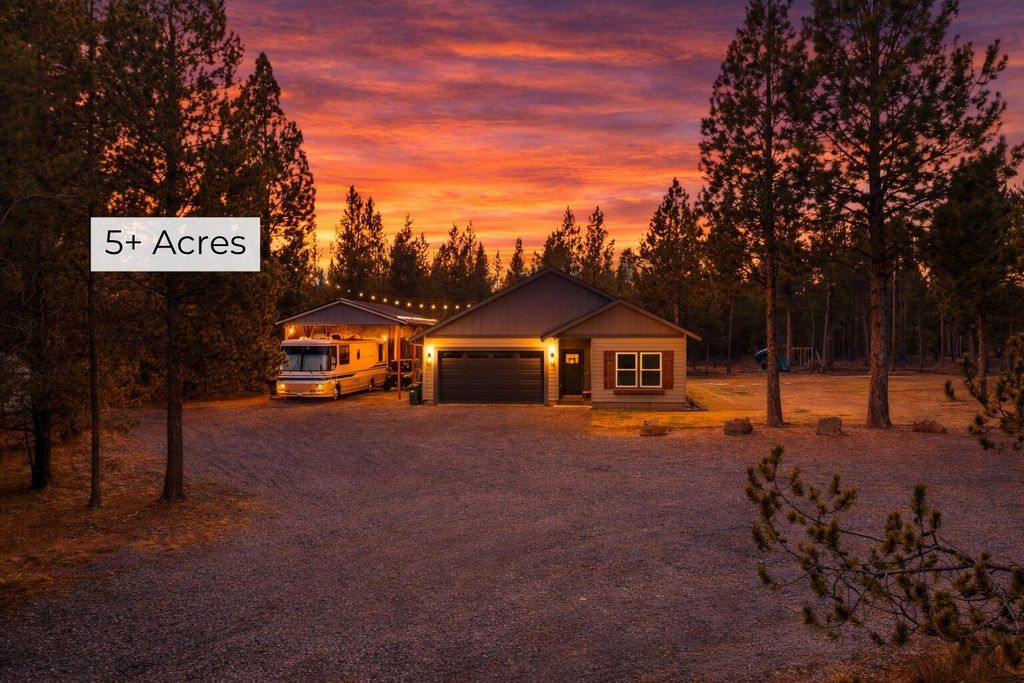 A rare find-5 private acres on a quiet, dead-end paved road backed to Shanda. Wind down the long driveway and arrive at your own secluded retreat featuring a move-in ready 2021 home built by local custom builder. Inside, a thoughtful split-bedroom floor plan, 9-foot ceilings, and fresh interior paint. Oversized windows flood the main living space with natural light and frame nothing but trees-no neighbor views. Vaulted tongue-and-groove ceilings add a modern cabin feel, while the kitchen shines with quartz countertops, tile backsplash, and under-cabinet lighting. Tongue & groove expands into the primary suite and an ensuite features dual vanities. Outside, enjoy gatherings on the paver patio or cozy up under the gazebo year-round. The large yard takes care of itself with underground sprinklers with timers. Complete with a 2 car garage, RV carport with hookup, storage shed & a cleared 50x50 space to build the shop of your dreams. Seller is licensed real estate agent in the state of OR.