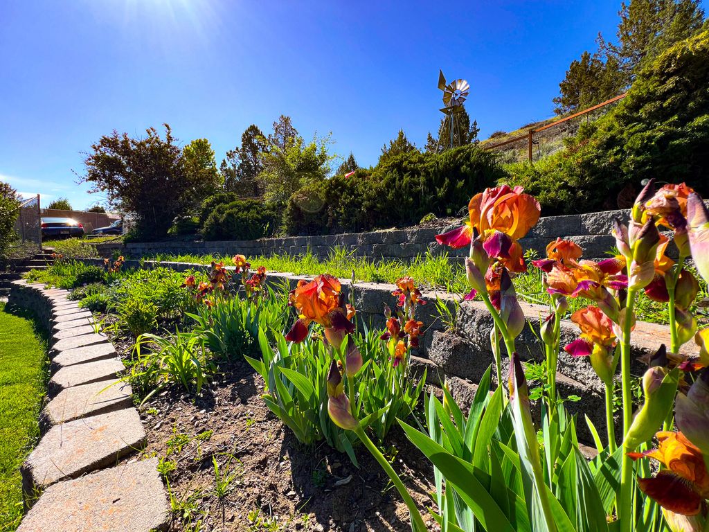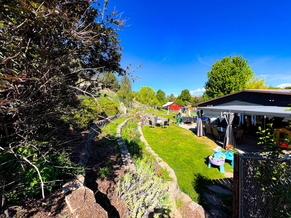 Enjoy a terraced yard with annual flowers, a water feature, swing set, chicken coop, greenhouse, underground sprinklers, water right