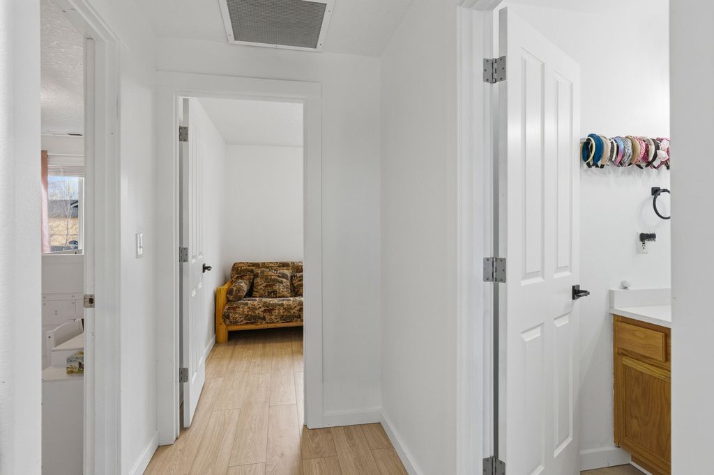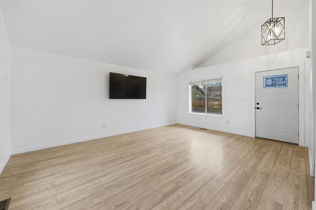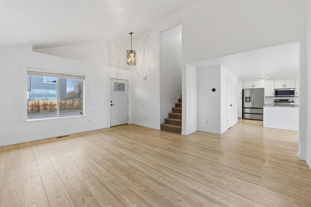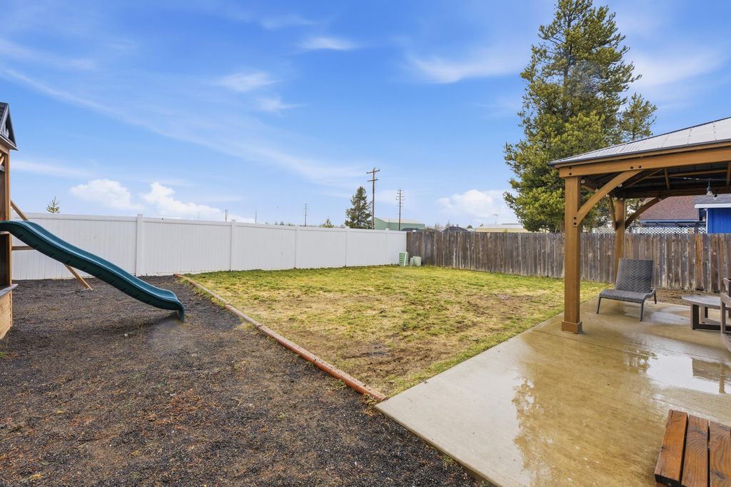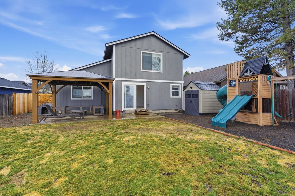 Step into this adorable, two-story home at the South end of La Pine! This open floor plan offers 1,370 square feet of living space that feels even larger. Interior features include: vaulted ceilings, heat pump/central air, new flooring, new interior paint, updated laundry area w/ shiplap details, updated bathrooms, new lighting fixtures and brand new kitchen complete with custom, soft-close cabinetry, island with pull-out spice drawer, new stainless steel appliances, tiled backsplash, granite countertops, and ample storage, including a pantry. Enjoy the mountain views from the completely fenced and landscaped backyard, featuring a new sprinkler system and gazebo with a concrete patio. Other exterior features include: new exterior doors, new roof in 2025, new exterior paint, storage shed, and additional paved parking with room for an RV. Great location minutes from City Center, perfect for all-year-round living or as a residential income opportunity.