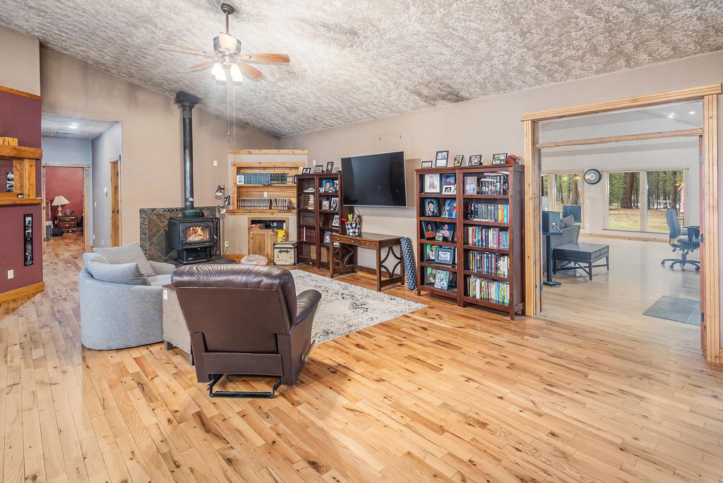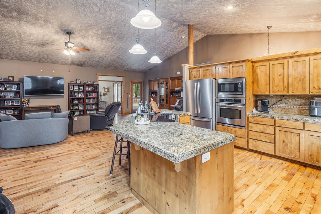 Elegant Parsons home features an Open floor plan with a large kitchen fit for a chef, stainless steel appliances, and large island with seating. Large Primary bedroom with high ceilings and walk-in tiled shower. Full 4 bedrooms plus Den/office with hardwood floors throughout the home. Backyard irrigation, Vacuum system, large utility room. Extra 28'x56' guest quarters with full bath and washer dryer hookup off the back of shop. Pool table and Hutch included in sale. Close to the area lakes and fishing. 5 minute walk to state park with river access and BLM land for all those off road and outdoor activities! Road maintained by a special road district. Seller is licensed Real Estate Agent