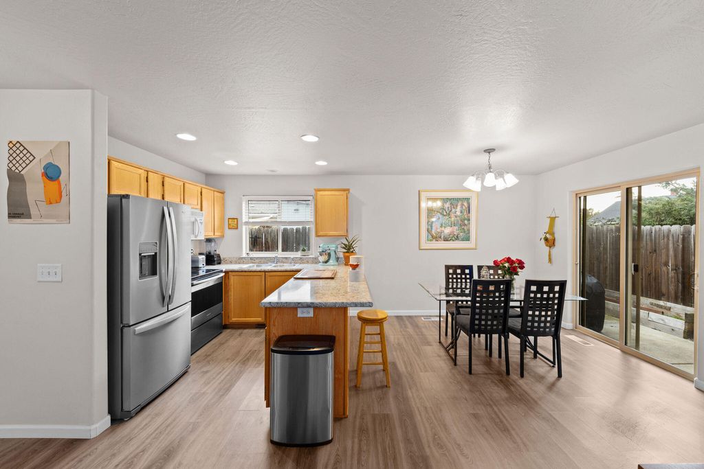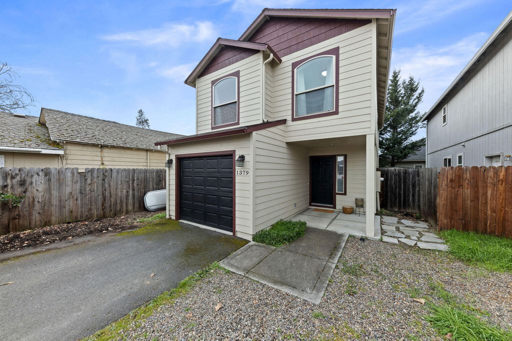 Great investment opportunity or perfect place to call home in Central Point! This charming 3 bedroom, 2.5 bath home offers 1,343 sq ft of functional living space designed for comfort and convenience. The open-concept main level features a spacious Living area, Dining space, and a Kitchen with ample counter space and a breakfast bar ideal for everyday living and entertaining. Plenty of natural light throughout. Upstairs you'll find all 3 Bedrooms, including a spacious Primary Suite with vaulted ceilings, ceiling fan, walk-in closet, and an en-suite bath featuring double sinks and a walk-in shower. The additional Bedrooms offer comfortable space for guests, family, or a home office. Outside is a fully fenced, low-maintenance backyard with a patio and small storage shed. Perfect for entertaining or a small garden. This home also includes a single-car attached garage. Located near schools, parks, shopping, and local amenities, this home offers low-maintenance living in a desirable location