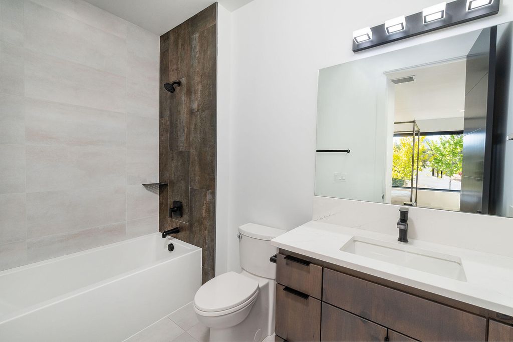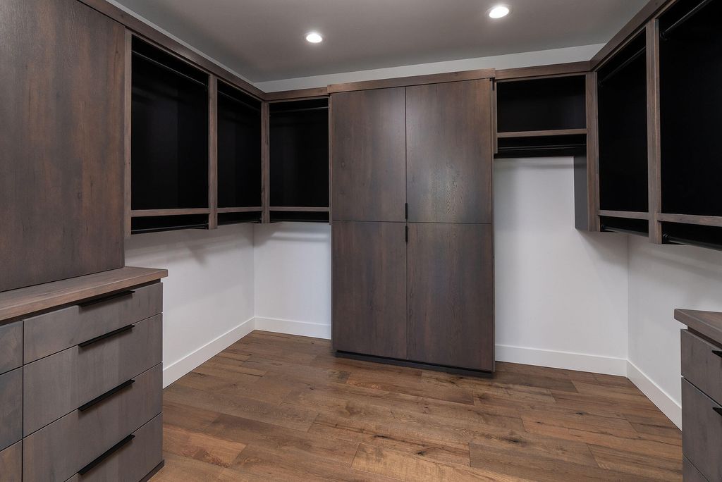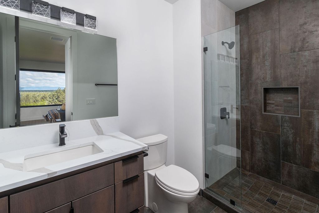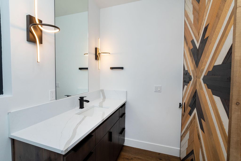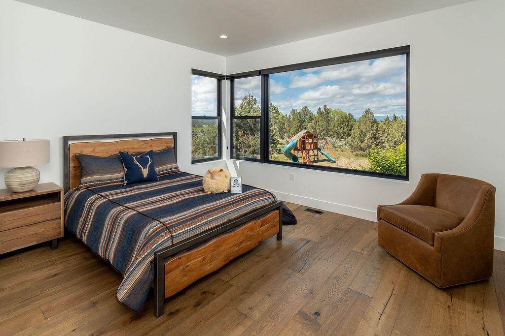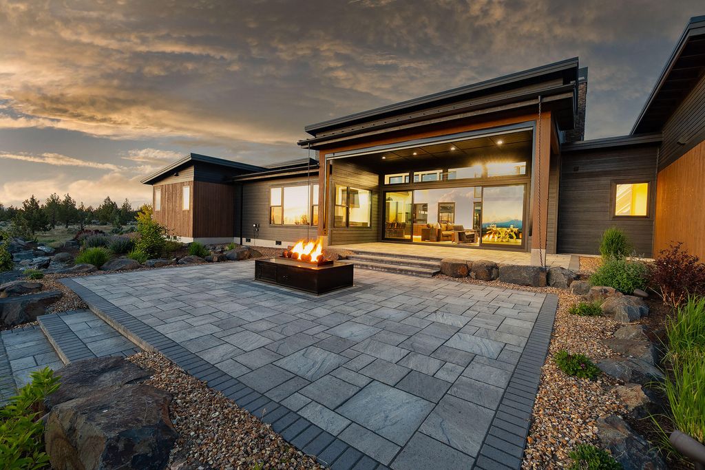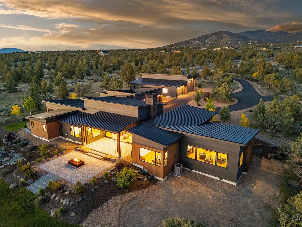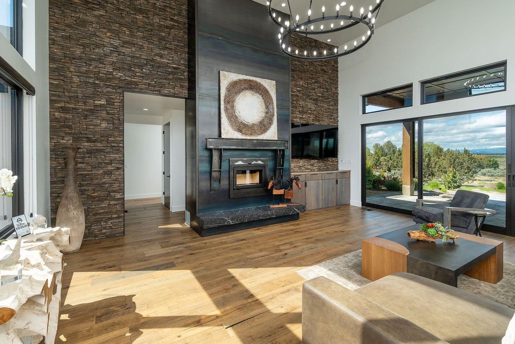 Breathtaking Cascade Mountain views frame this stunning modern home featuring soaring ceilings, a dramatic floor-to-ceiling stone wall surrounding the sleek modern fireplace, and expansive sliding glass doors that open to an outdoor living patio with custom fire pit. The chef's kitchen offers a large quartz island, high-end stainless range, custom cabinetry, and designer lighting, seamlessly flowing into the dining and great room--perfect for entertaining. The versatile bonus room is ideal for entertaining or relaxing, featuring a stylish wet bar that makes hosting effortless--perfect for movie nights, game days, or a private lounge. Two well-appointed guest bedrooms each offer their own ensuite bath, providing comfort and privacy. Thoughtful finishes, warm wood floors, and indoor-outdoor living create a refined yet inviting retreat in a spectacular setting.