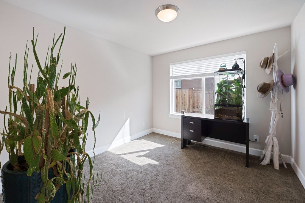 Don't miss this meticulously maintained single-level home built in 2020 by WoodHill, offering 1,457 sq ft, 3 beds, 2 baths, and no HOA on Redmond's desirable west side with peekaboo mountain views. The bright open floor plan features vaulted ceilings, a spacious great room, and a cozy gas fireplace with tile surround, custom mantel, and built-ins. The gourmet kitchen includes quartz countertops, an island, stainless steel appliances, and custom cabinetry. The primary suite offers a double vanity and walk-in closet. Enjoy an oversized, fully fenced backyard with covered patio, mature landscaping, and raspberry and blackberry bushes. Located in a quiet, low-traffic neighborhood with easy access to Sisters, Bend, and downtown Redmond's dining, shopping, and schools.
