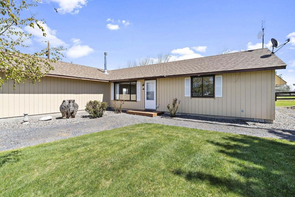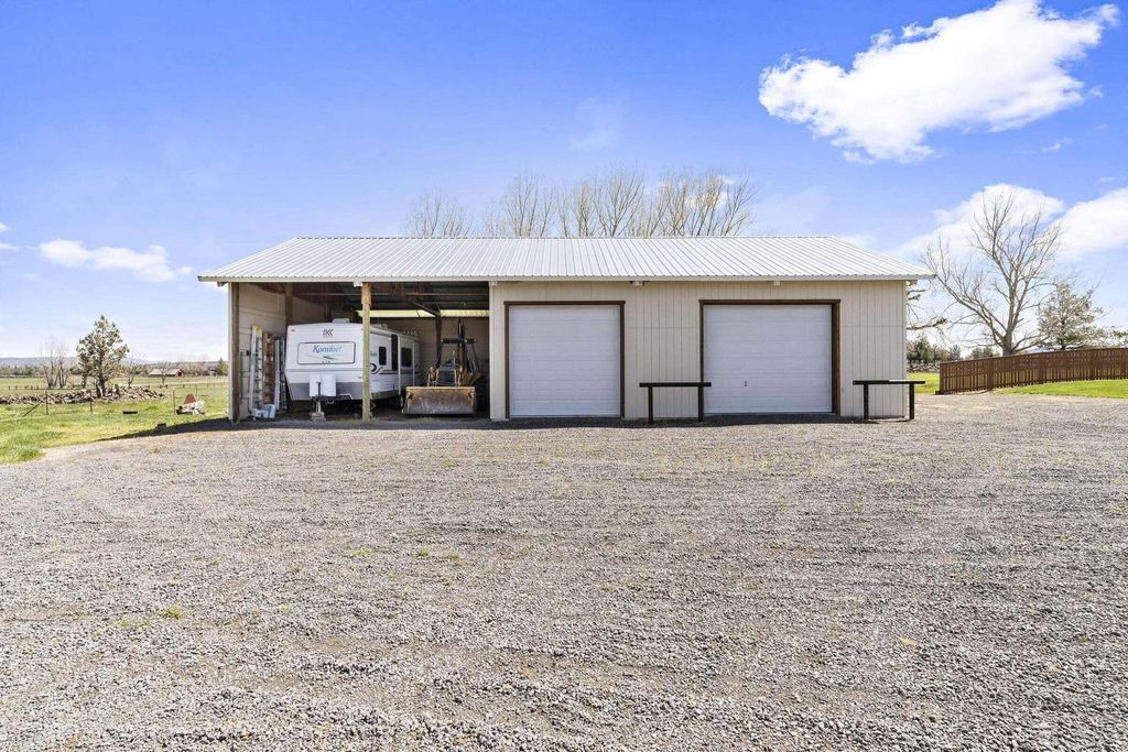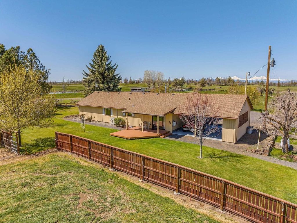 Live the Powell Butte Farm & Ranch Lifestyle! 39.21 ac w/ 34.5 acres of COID water rights, turnkey setup w/ easy management for livestock, hay production & country living. Flood-irrigated pastures & productive grass hay ground supported by several ponds for efficient water delivery--ideal for a sm cattle operation or hobby ranch. 5-bay barn w/ hay storage (approx. 50 tons), tack room, loafing sheds, corrals, pens, squeeze chute & calf table for streamlined herd management. Comfortable 1,344 sq ft home (3 bed, 1.5 bath, built 1985) privately set w/ Cascade Mountain views. Vaulted L/R w/ propane stove & mini split open to Kitchen & D/R w/access lg open patio, landscaped, fenced yd, garden area, fruit trees & dog kennel creating a true country retreat. Newer HP/AC adds year-round comfort. Addt'l features include heated 24x36 shop w/ 220 power, storage room & loft, dbl att garage, carport & good-producing private well. Embrace the working ranch lifestyle in the heart of Central Oregon.