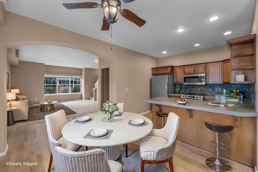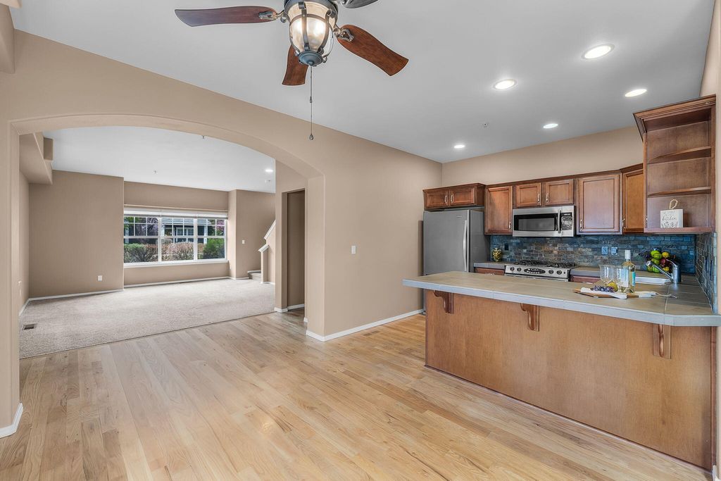 Beautiful corner townhouse offering 1,330 sf of comfortable living space. Built in 2006, this light-filled home features a welcoming living room with a cozy gas fireplace and abundant natural light streaming through multiple windows in both living & dining area. The upgraded kitchen includes a gas range, slate tile countertops & slate brick backsplash, plus all SS appliances included. Primary on upper level with walk-in & 2nd closet, slate counter in Primary bath. Two spacious bedrooms and main bath plus laundry area complete this upper floor. Red Oak hard wood floor and carpet add warmth & comfort throughout. Enjoy a single-car garage & a fenced, landscaped yard with sprinkler & drip system-ideal for relaxing or outdoor gatherings. Conveniently located near shopping, restaurants, hospital & new Central Library. Explore nearby canal trails for walking or biking & enjoy the Gardenside community park for outdoor fun! A great property to call Home!!