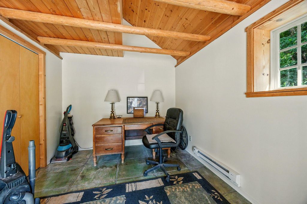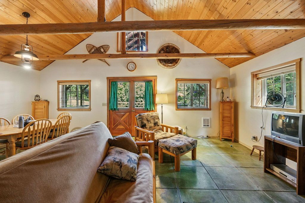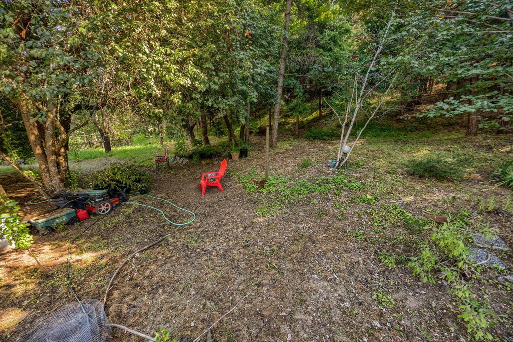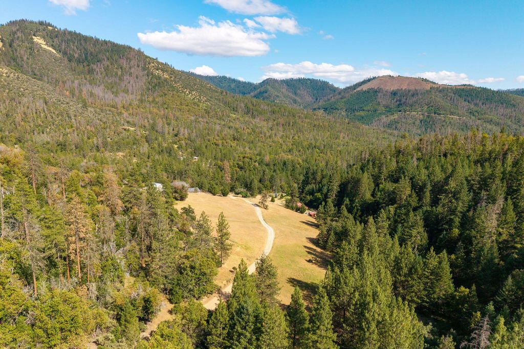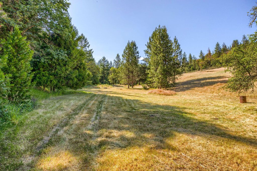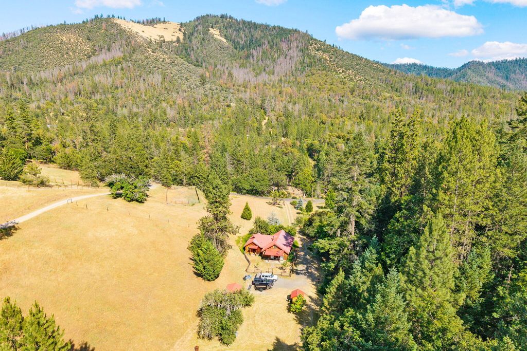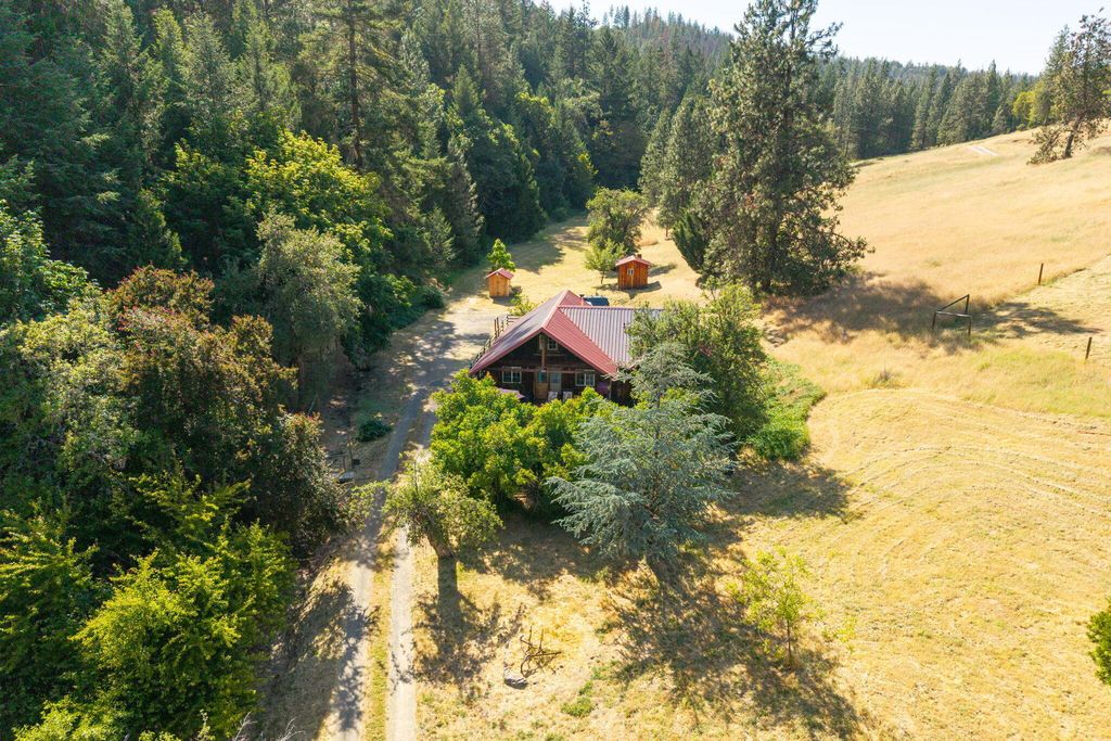 Picturesque little valley backing up to BLM land & Sterling Dutch trail on 43.20 acres. Rich in history dated back to 1856 homestead in Sterling Creek nestled in Southern Oregon. Charming log style home, Knotte pine doors, vaulted rough cut beams and Knotte pine ceilings. Enter in to the great room/dining room through a lg cedar deck for entertaining and beautiful landscaping w/dbl doors, Vermont cast iron fireplace w/cooking plate. Open staircase to 3rd bdrm or great office. Vaulted wood ceilings in primary suite, 3 lg closets and bath. 2nd bdrm off back of home w/open kitchen, lg walk in pantry w/ hickory cabinets and glass fronts. Milgard dbl pane windows. French doors to a covered patio. Beautiful property w/fruit trees, grape arbor, fenced garden and Dog Park. 3 sheds, slate walkways and great well! Super charming property close to Jacksonville