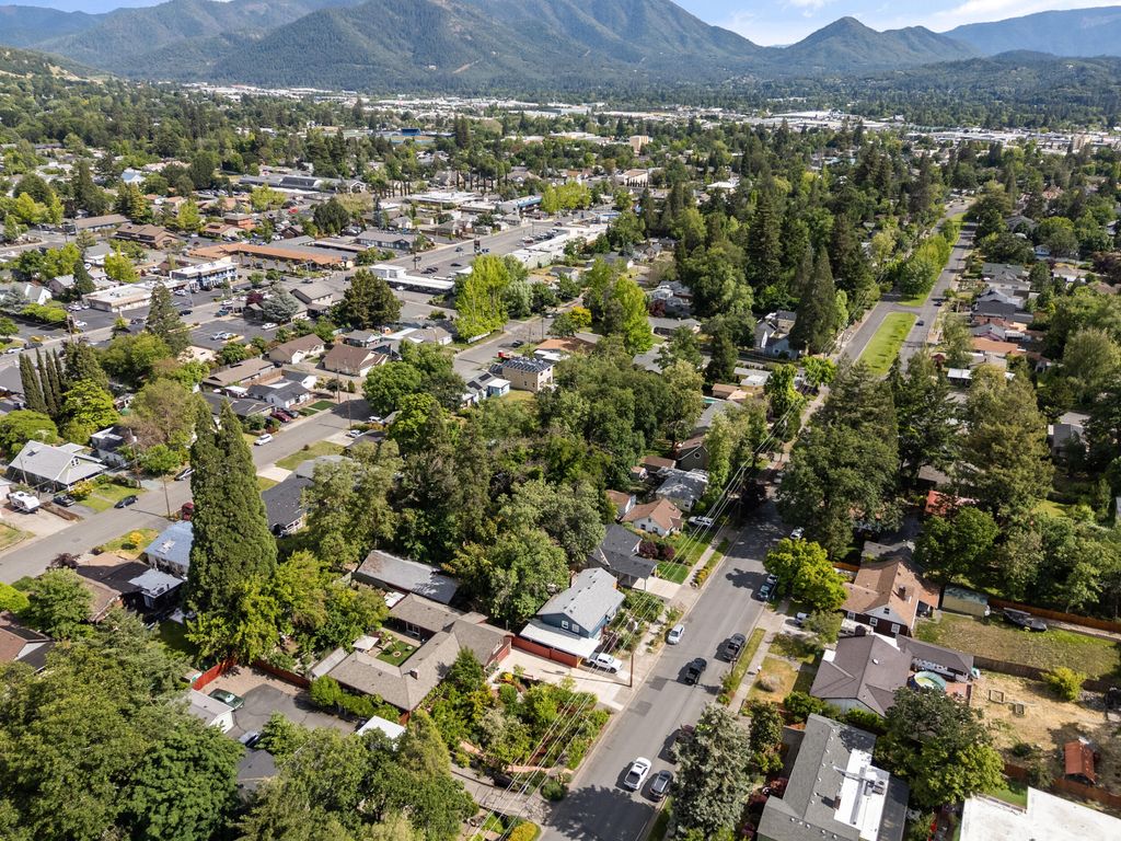 Storybook charm meets unbeatable location on this private property in one of Grants Pass' most sought-after neighborhoods. Situated on just under 1/3 acre, you can walk to restaurants, shopping, and the Farmers Market while enjoying your own peaceful retreat. Wander whimsical garden paths with trellises, a bridge, courtyard, sitting areas, edible and ornamental plants, plus a greenhouse. Inside, vaulted ceilings with exposed beams, tongue-and-groove ceiling, and a cozy gas fireplace create warmth and style. The updated kitchen features stainless appliances, solid surface counters, two sinks, and modern touches. Rare find: all 3 bedrooms are private suites, each with its own full bathroom--perfect for guests, multi-generational living, or privacy. Includes both living and family rooms, updated windows, flooring, and paint, all with a stylish mid-century modern vibe. Don't forget to click on video of the home.