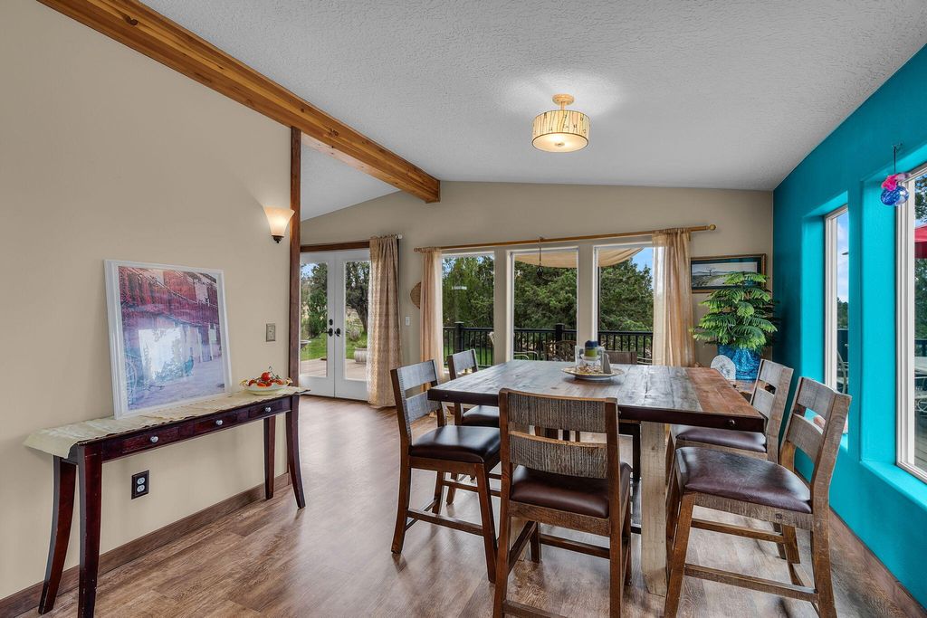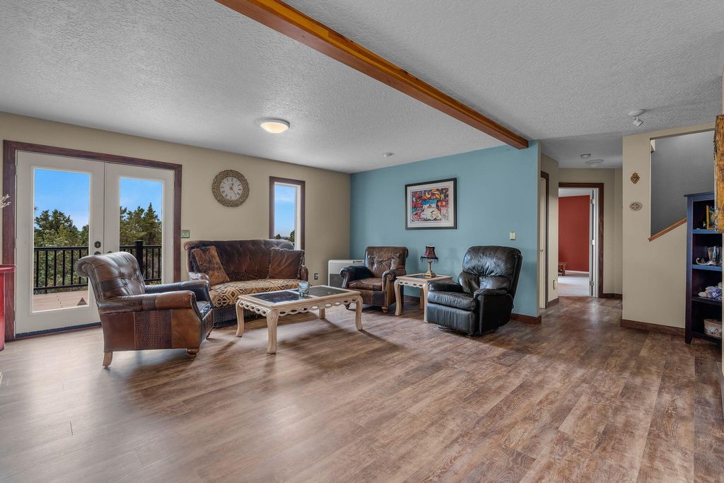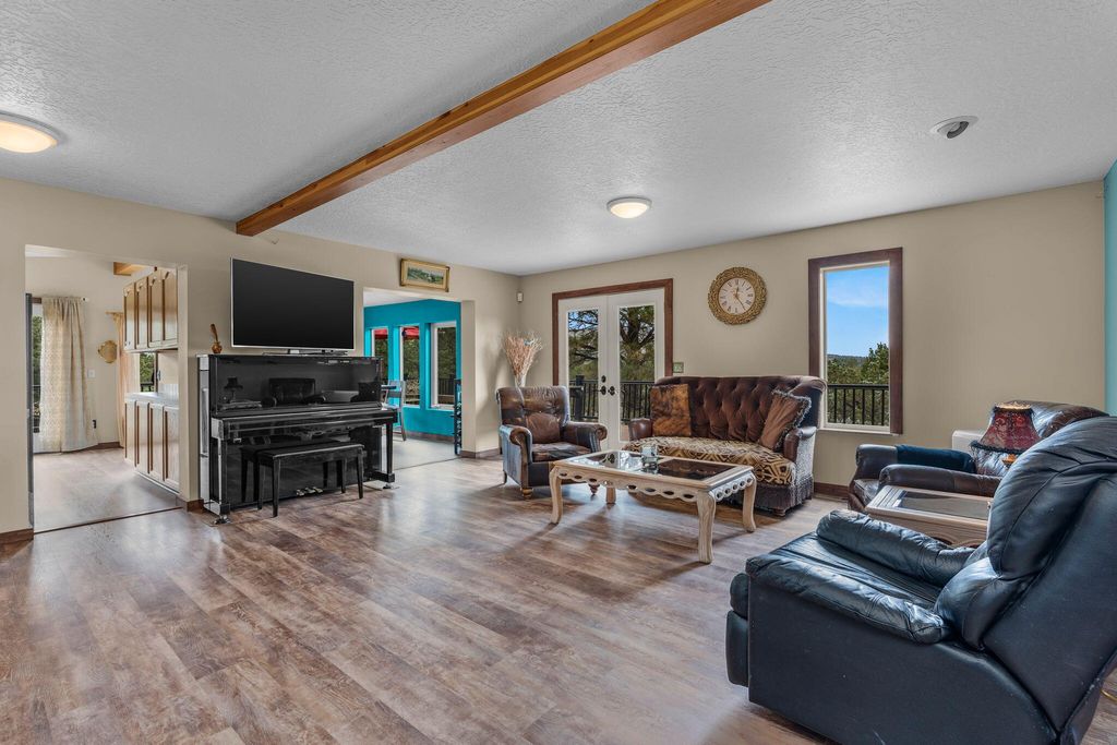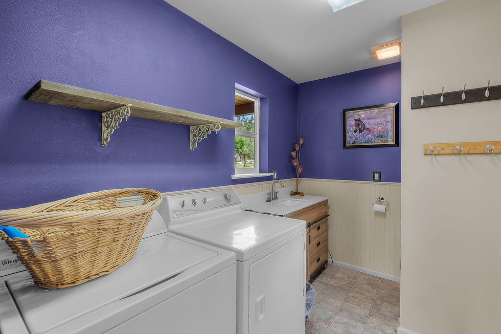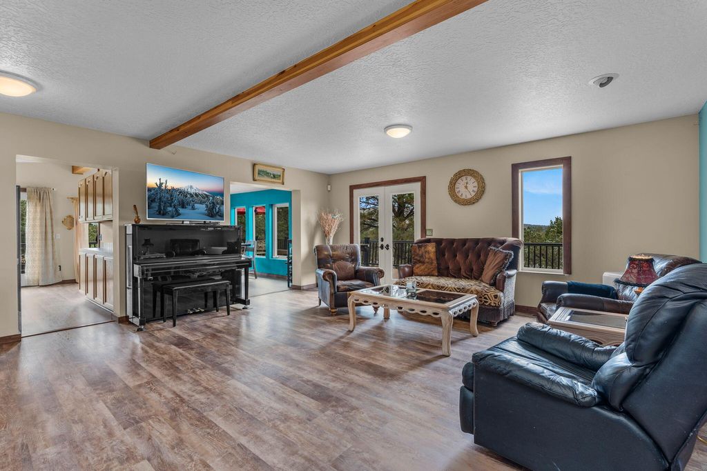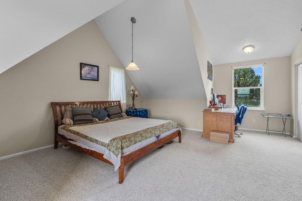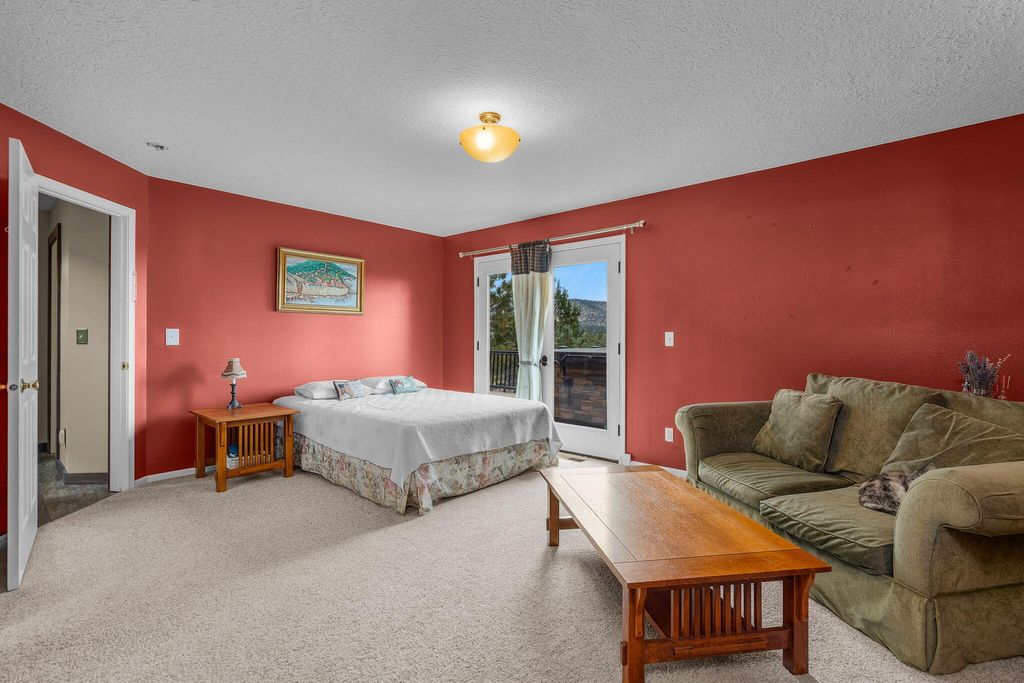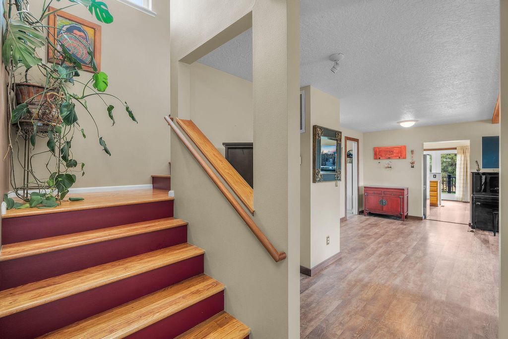 Floor plan features a spacious main-level primary suite w/a walk-in tile shower, an expansive living room, upstairs loft/bonus room w/ vaulted ceiling w/two additional bedrooms with full bath. Large utility/laundry room w/exterior access adds convenience. Step outside to a massive wraparound deck, perfect for entertaining or simply soaking in the natural beauty. Energy-efficient rooftop solar panels provide sustainable living.
