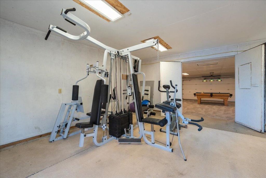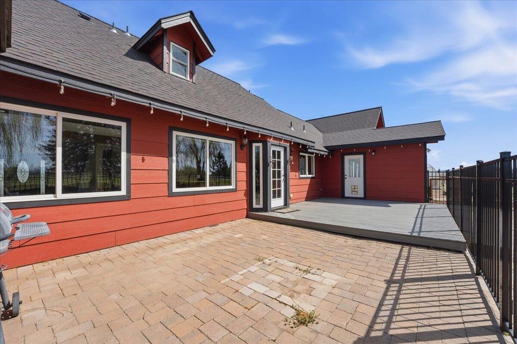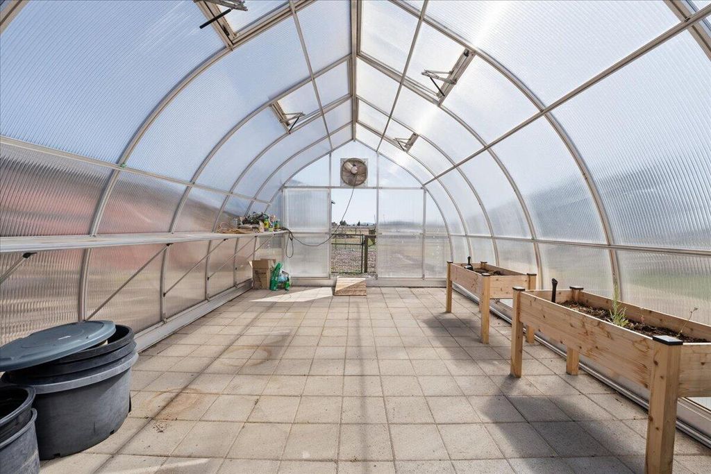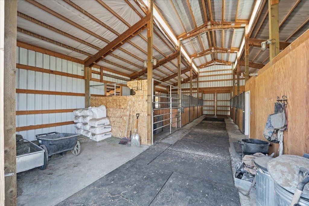 The property includes a seven-stall barn, fenced and irrigated pasture, a four-bay shop with an 18' roll-up door, a two-bay she-shed with a GYM & Billiards table, a large greenhouse, raised garden beds, and a custom chicken coop. An irrigation pond. and more