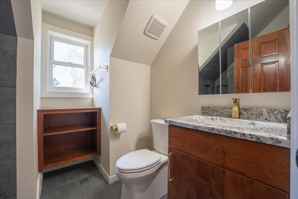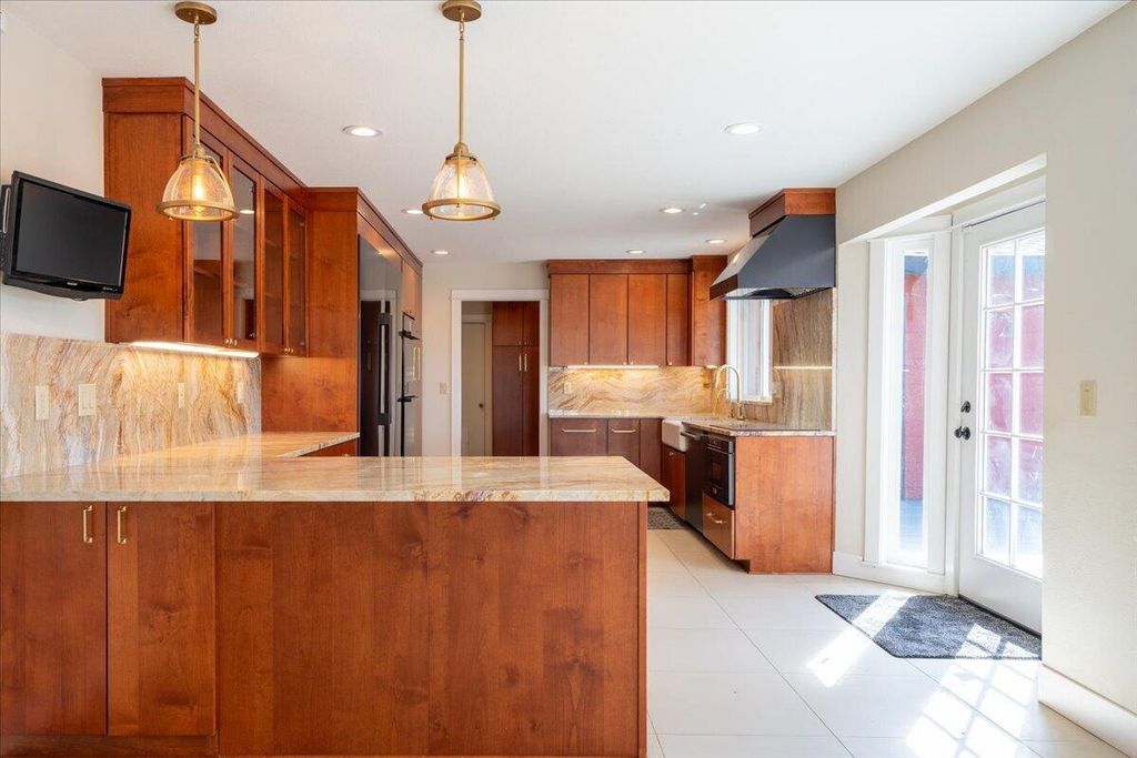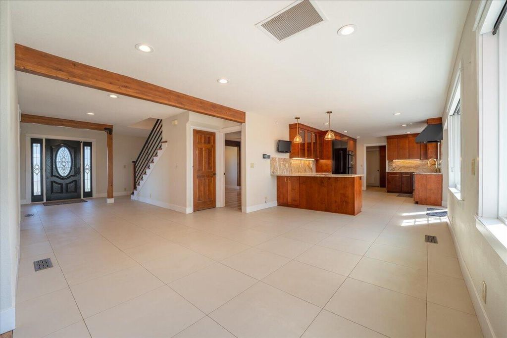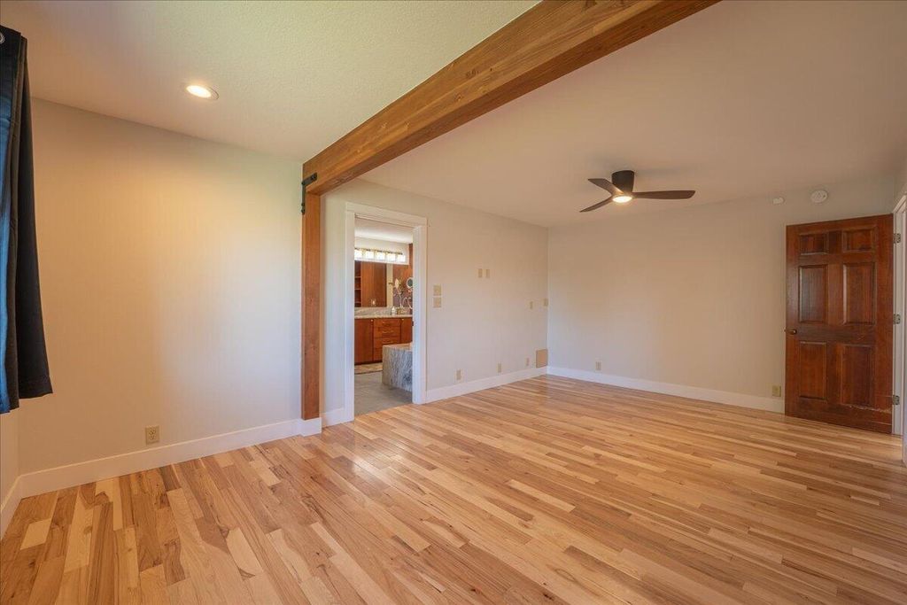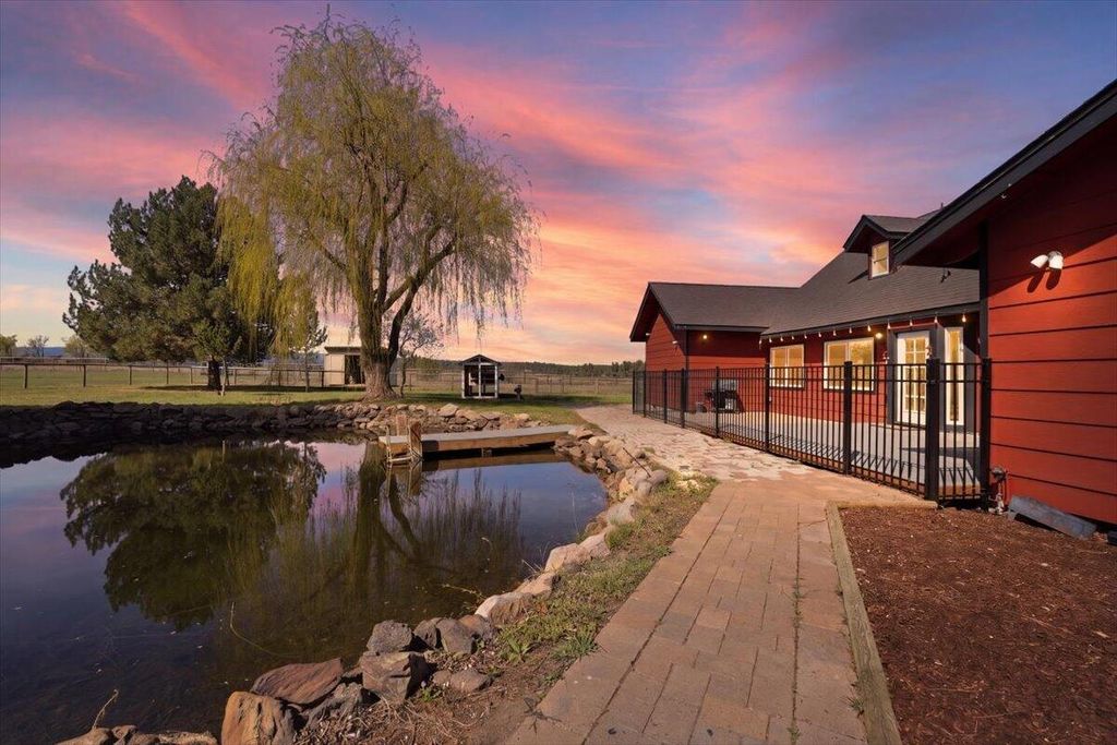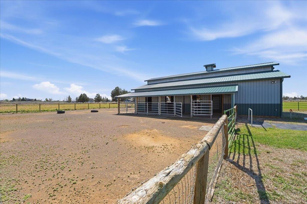 This move-in-ready home, remodeled by Neal Kelly, is a farm property located just minutes from Tumalo. The interior features stunning updates, including quartzite countertops, an attractive backsplash, a farmhouse sink, black stainless steel Dacor appliances with an induction cooktop, soft-close birch cabinetry, and large porcelain tile flooring. The expanded primary bedroom showcases wood beams, a spacious soaking tub, a marble shower and countertop, a matching tub surround, and a roomy custom closet. The inviting living room offers a vaulted ceiling, exposed wood beam, electric fireplace, hardwood floors, and mountain views. There are two separate office spaces, both with mountain views, hardwood floors, and vaulted ceilings.