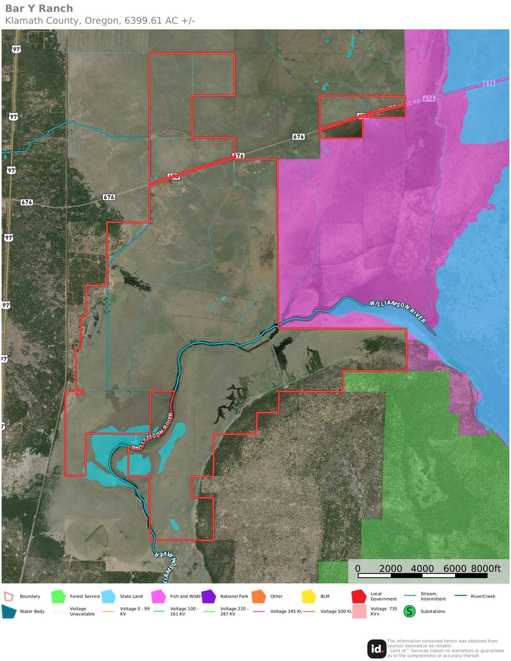 Bar Y Ranch offers the cattleman or investor a unique opportunity to acquire this reputable higher-elevation summer cattle pasturing operation. The 6,399.61± mostly contiguous acres include 5,248.3± acres of water rights available for a 125± acre center-pivot, and 4,427.2± acres of flood irrigated pasture, plus additional sub-irrigated pasture. An expansive set of cattle working corrals with scales, hay storage, a Quonset shop, housing, and various outbuildings all support cattle operations. With good management and adequate labor, a savvy operator can summer a significant number of cow/calf pairs and/or yearling cattle on this ranch. The Williamson River meanders through or borders the ranch for 2.85± miles. From the ranch, 47± miles to Klamath Falls for goods and services, and 90± miles to Bend. If you are looking for a significant holding with solid cattle production capability, plus recreational benefits in a beautiful mountain climate, you should take a serious look at this!
