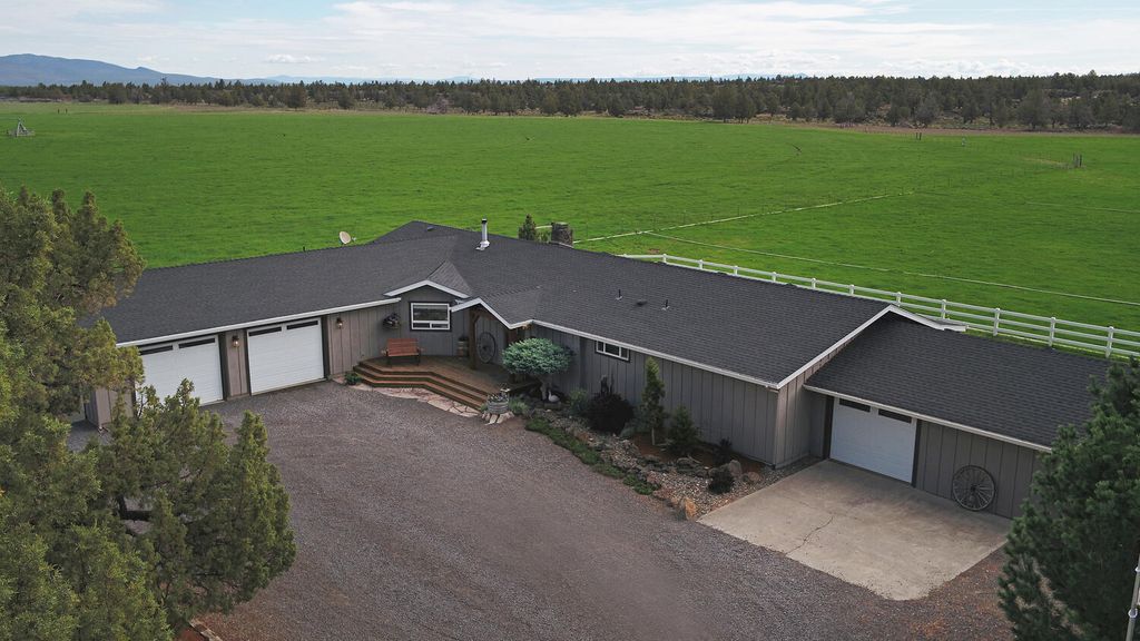 This private ranch property blends natural beauty with practical amenities across 84.93 acres, with 48 acres of COID irrigation. With direct access to public lands, outdoor adventure is right at your doorstep. The home welcomes you with a spacious great room, a floor to ceiling stone fireplace, a sunlit dining area, and sweeping views of the surrounding landscape. The updated kitchen includes an island cooktop and pantry, perfect for culinary enthusiasts. Equestrian lovers will appreciate the 5,040 sq. ft. hay barn, easily adaptable to horse stalls or an indoor arena. Additional structures include a dedicated water storage building and a finished 575 sq. ft. space with a bath"”ideal for ranch help, creative projects, or a private studio. Efficient irrigation is ensured with two pivots, making land management a breeze. Whether you are seeking a working ranch, a hobby farm, or peaceful rural lifestyle this Central Oregon gem offers space versatility and endless possibilities.