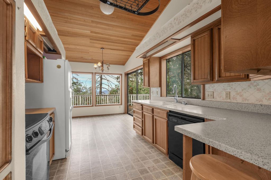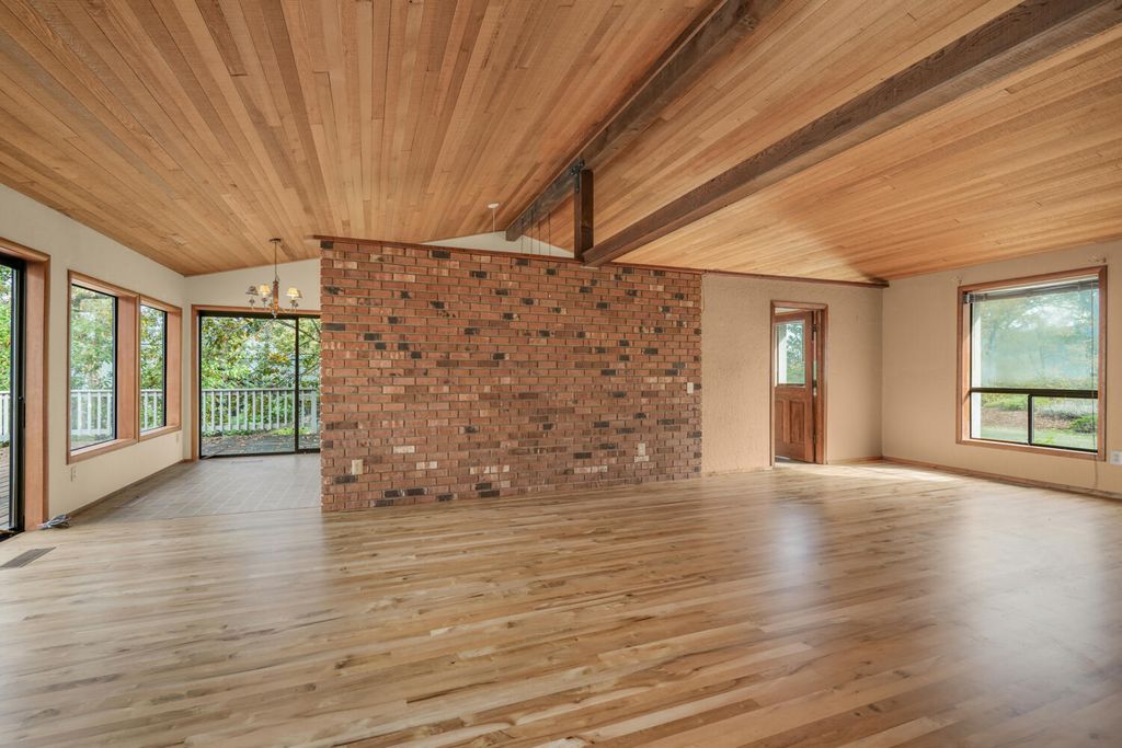 Contemporary-style home on .49-acre lot overlooking the city! Designed for entertaining, this 3-bedroom, 2.5-bath home has new Myrtlewood flooring throughout living room w/ vaulted wood ceilings, fireplace & sliders to deck w/ stunning city views. Kitchen w/ Corian countertops, large eating nook & c butler's pantry w/ adjacent dining area opening to deck for indoor/outdoor gatherings. Primary suite on main level w/ 440 sq. ft. addition featuring private bath w/ built-in hot tub, tiled shower, dual vanities, dry sauna & 2 walk-in closets. 2 additional bedrooms, full bath & laundry complete main floor. Upstairs is great room w/ French doors to balcony, kitchenette & half bath providing options as recreation room, media space, guest quarters or home office. Additional highlights include new roof, natural light, & close to restaurants, parks, schools & quick I-5 access. Enjoy exceptional views, privacy & versatile living spaces in this one-of-a-kind city-view home.