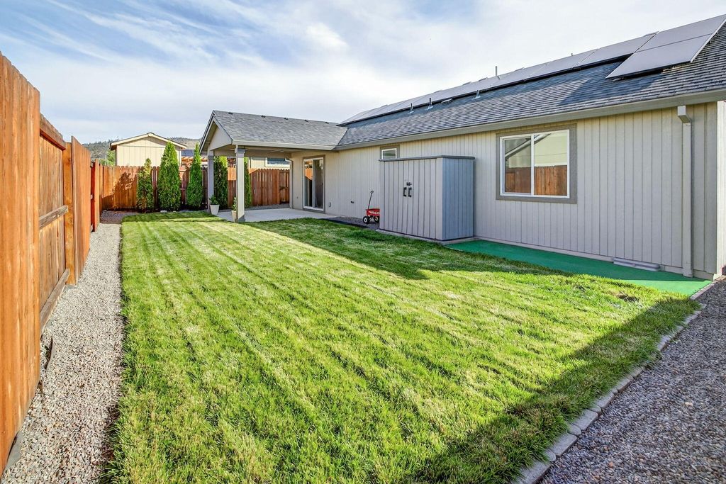 Better than new! This beautifully maintained single-level 2019 E. Medford home is move-in ready & full of thoughtful upgrades, including a paid for solar system! So much savings! Enjoy territorial & mtn views from the lg kitchen window, along w/upgraded features-custom window blinds/shades, newer stainless-steel fridge & range/oven, higher end fixtures & toilets, added garage shelving & insulation & backyard storage shed. The vaulted great room & tiled entry create a spacious, welcoming feel, while the primary suite offers a ceiling fan, double vanity.. a relaxing retreat. A covered patio provides yr-round outdoor enjoyment"”perfect for quiet evenings or barbecues w/family & friends. Front & back sprinklers make yard care easy & the landscaping offers just enough green to feel tranquil w/o much maintenance. Nestled in a desirable neighborhood of newer homes & conveniently located near shopping, healthcare & schools. Recent home inspection completed"”this home is truly in tip-top shape