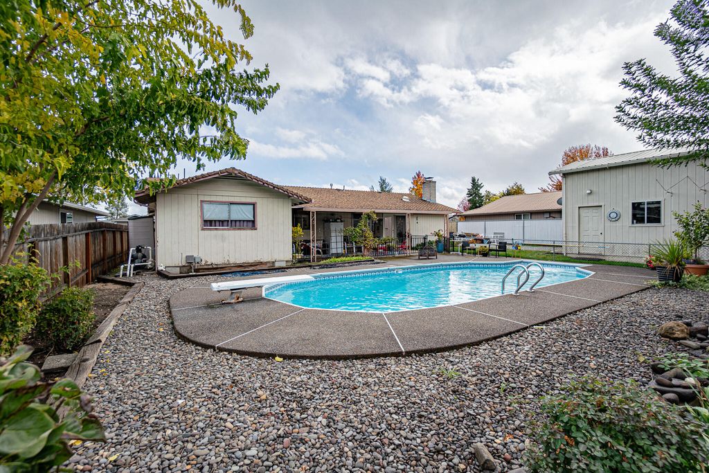 This Central Point home has everything. House, pool, shop, and RV parking! The 1,548 sq.ft. home has three bedrooms and two full bathrooms. There is a living room as well as a family room. The kitchen has plenty of cabinets and counter space. Three large sized rooms with the primary bedroom at the back of the home. The primary bedroom has a slider that leads out to the covered patio and inground pool. Outside you will find an inground pool that is serviced yearly and a fenced yard. Covered patio for entertaining. As a bonus at the end of the RV parking is a large shop for working on cars, hobbies, or other uses. This property is located close to Scenic Middle School and in a great neighborhood.