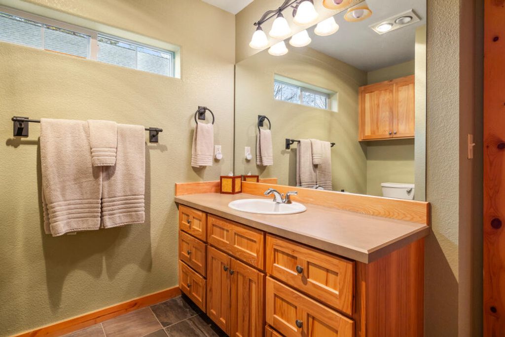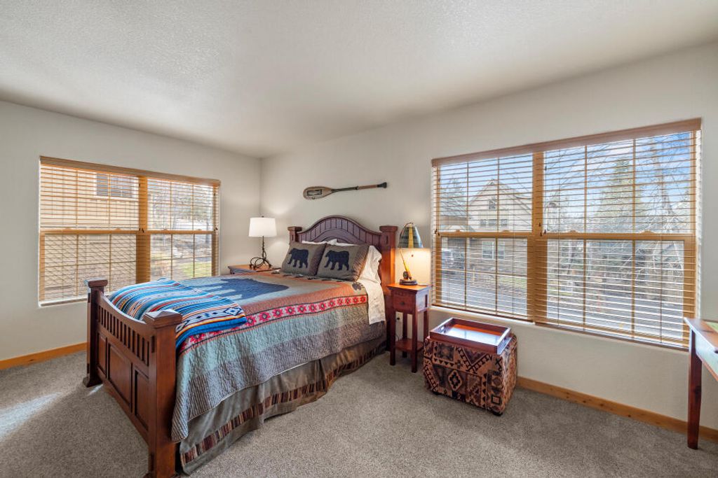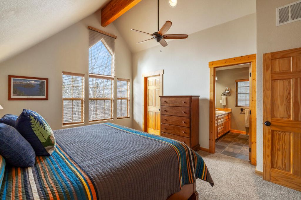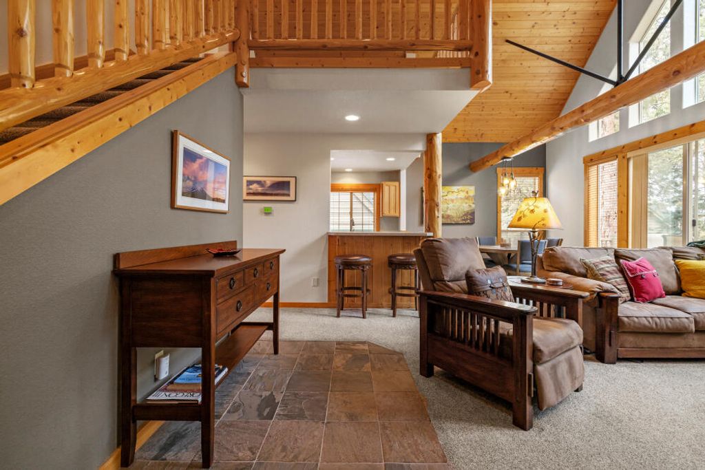 Beautifully maintained 2-bedroom, 2-bathroom chalet located in the desirable Running Y Ranch Resort. Both bedrooms are spacious serving as primary suites, perfect for guests or an in-law setup. The upstairs suite features a walk-in closet, an enclosed bathroom, and abundant natural light. The open concept living area boasts vaulted ceilings, upgraded carpet, wooden blinds, and a fully equipped kitchen with stainless steel appliances. A separate laundry room offers cabinetry and a full-size washer and dryer. This home is being sold fully furnished and currently set up as a successful vacation rental, complete with a fully stocked kitchen and comfortable furnishings. Step outside to the inviting deck and all the amenities the resort has to offer, including outdoor trails, indoor swimming pool, tennis and pickleball courts, fitness center, playground, and less than a 5-minute drive to one of Arnold Palmer's ''Sweet Sixteen'' golf courses. Clear pest and dry rot report on file