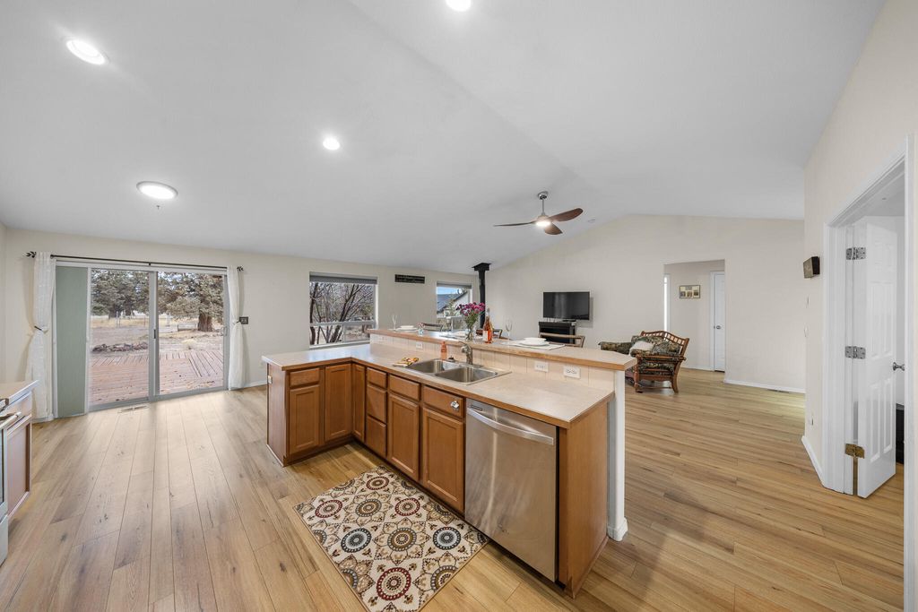 Beautiful single level home on over an acre, perfectly situated between Bend and Redmond. Featuring 3 bedrooms, 2 bathrooms, a dedicated office, and an open-concept layout, this property blends comfort, charm, and spacious living. The privately placed primary suite includes a lock-off option and its own exterior entrance, ideal for multigenerational living or a short-term room rental. Recent updates include fresh interior paint, upgraded lighting, ceiling fans throughout, new blackout shades and stainless steel kitchen appliances. A certified wood stove adds both warmth and inviting character. Outdoors, the property shines with a large fenced backyard, ''power-ready'' RV side parking, an enclosed dog run, and ample space for future expansion or creative use. Out front, enjoy mountain views, mature aspens, and a tranquil pond water feature that brings movement and serenity to the landscape. Don't miss this combination of land, location, and functionality, all on one easy-living level!
