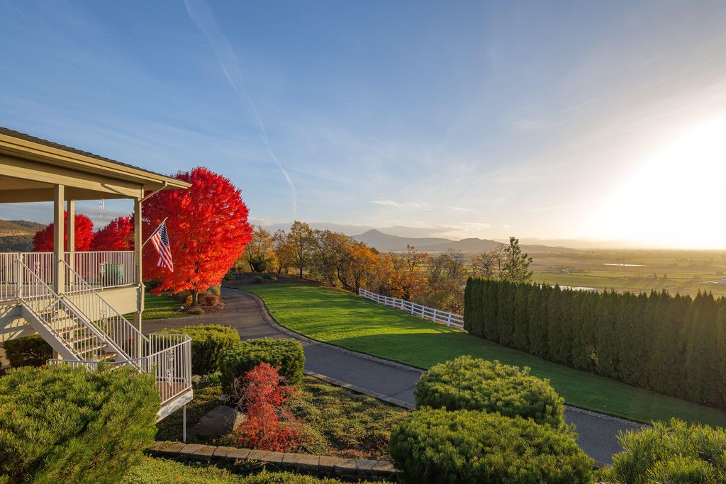 A distinguished country estate where timeless craftsmanship meets the beauty of Southern Oregon's landscape. Set amid 16 acres of lush, mature landscaping, this 4,810± sq. ft. residence offers refined single-level living with a lower-level guest suite. The home's warm cherry hardwood floors, coffered ceilings, and custom millwork complement expansive windows framing sweeping mountain and valley views. The chef's kitchen features granite surfaces, a large island, walk-in pantry w/butlers sink, and flows seamlessly into a dining space and elegant living room centered around a propane fireplace. French doors open to a private atrium with tranquil waterfall and outdoor kitchen just outside, perfect for entertaining or quiet reflection. Thoughtful design extends to three primary suites (two on the main level), zoned climate control, elevator access to the finished 3-car garage, and a wraparound porch overlooking manicured gardens and the serenity of this remarkable property.