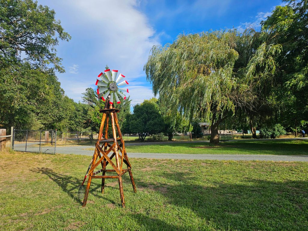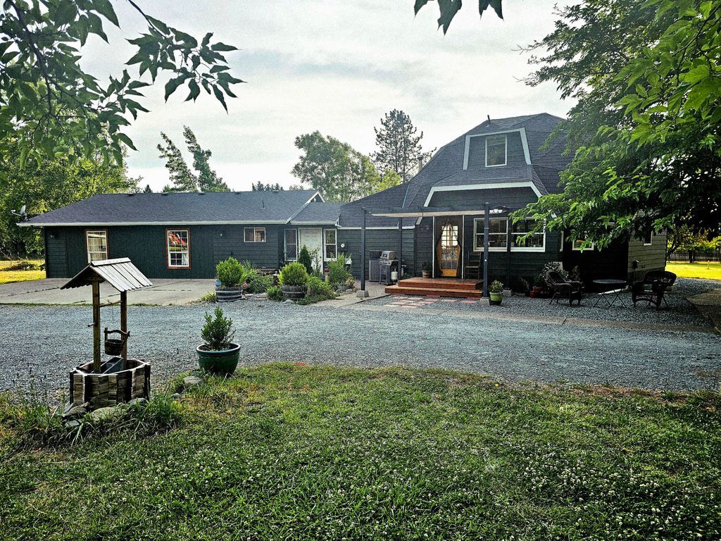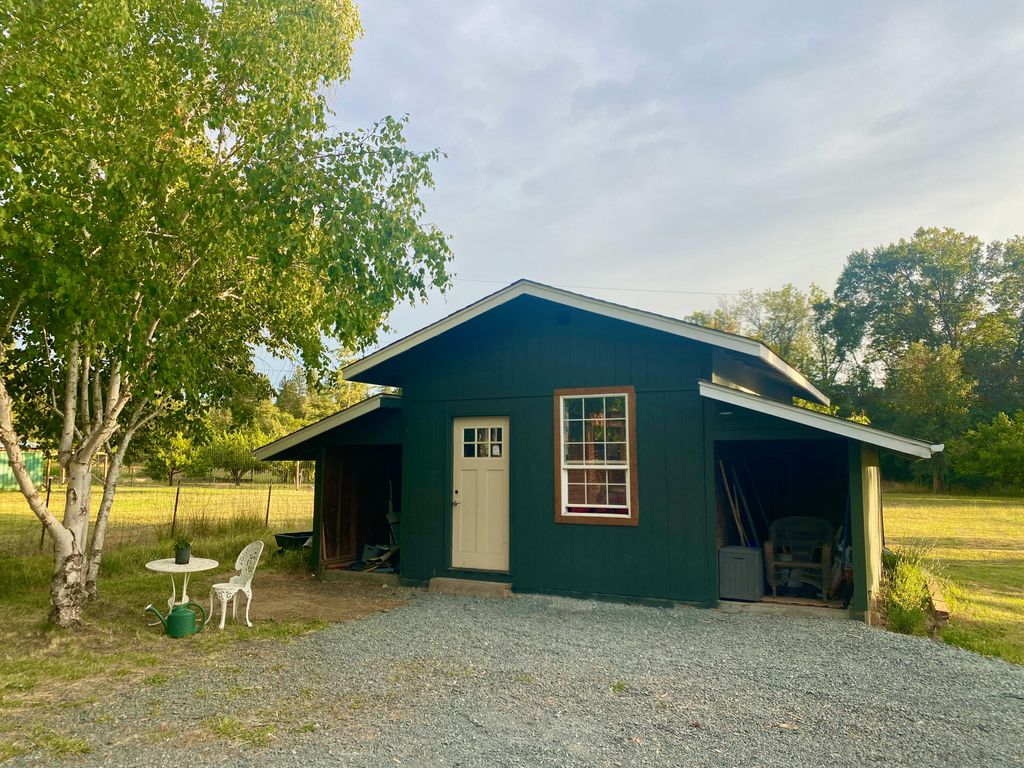 Welcome to Brookside Farm. A peaceful homestead nestled on 3.86 acres in a small town just minutes from Grants Pass. *Motivated sellers are relocating out of state. Enjoy privacy & convenience on this park-like setting. The charming dome house has primary bedroom & bath on the main floor, brand-new roof, flooring, carpet & interior/exterior paint, and includes a studio with bathroom, bedroom, new ductless heating/air & space for kitchen, providing potential for rental, extended family, guests, or home occupation. The fenced and gated property is well-suited for a variety of uses with livestock shelter, deer-fenced garden, small greenhouse, chicken coop & workshop. This lovely property welcomes you with mature fruit trees, small vineyard & meandering creek with forested backdrop-ideal for outdoor enthusiasts. Additional amenities include RV hookup, city water & private well! Whether you're seeking a private retreat, rural homestead, or hobby farm, this gem offers endless possibilities!