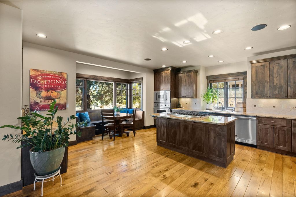 This Sun Forest-built home is perfectly positioned between the Cascades and the 5th fairway of the Nicklaus Signature Course in sought-after Juniper Preserve. The design is focused on living among the natural elements with an expansive covered patio space equipped with outdoor cooking amenities, a lodge-style gas fire pit for gathering, and 4 sets of glass sliders that create a flow of nature into the comfort of home. A large viewing deck off the Primary allows one to wake up to peaceful sunrises over adjacent BLM land and an intimate westward facing sun deck allows one to wind down with the sun setting over the Cascades. Discerning palettes will enjoy a towering rock fireplace, beautifully crafted arched windows, high-end cabinetry and surfaces, spa-like tiled bathrooms, and wide plank flooring. Over-sized three car garage and ample storage in both garage and home. New furnace, AC and solar panels. Offered furnished with Pronghorn Premier Membership included. Don't miss this one.