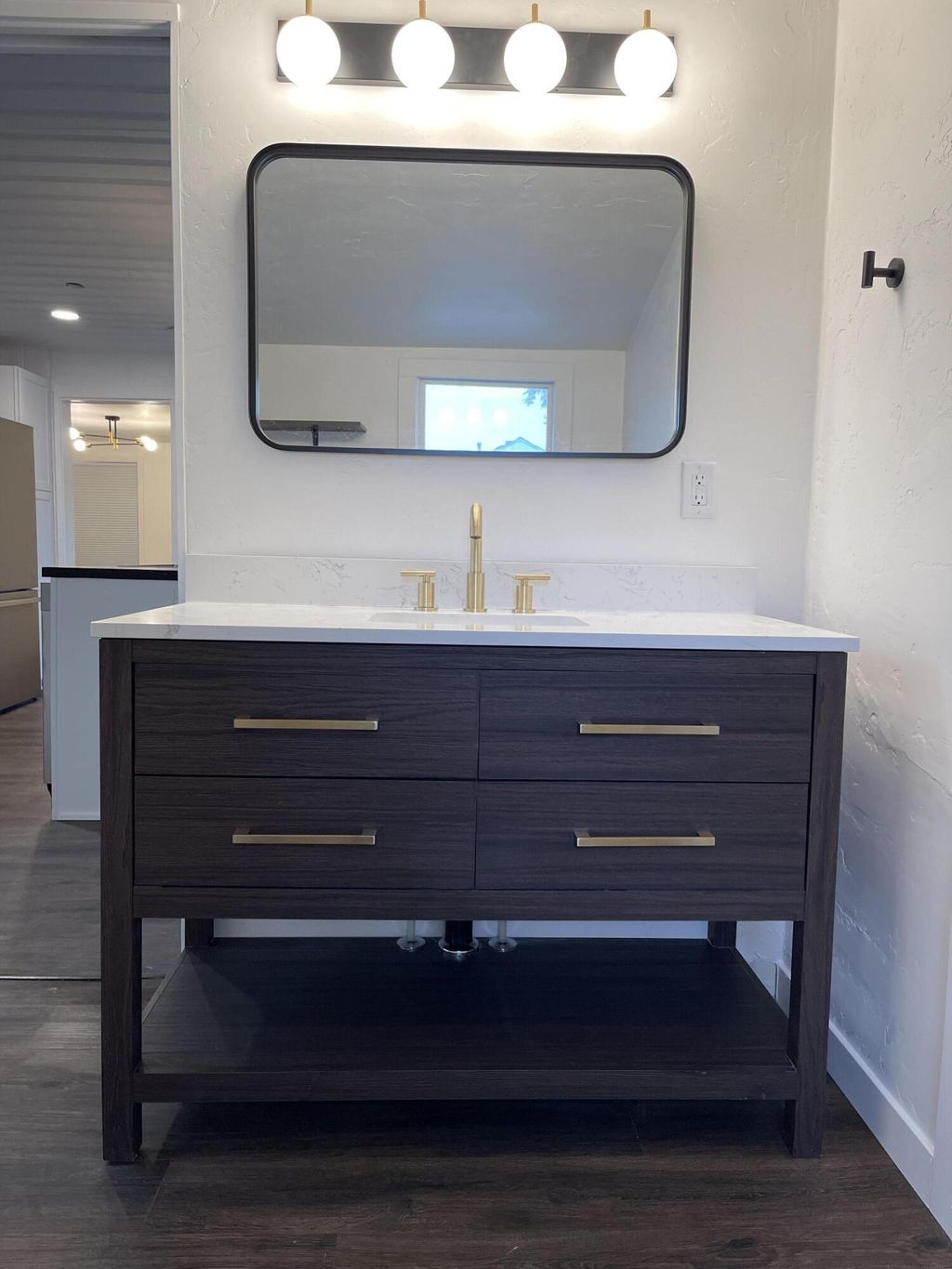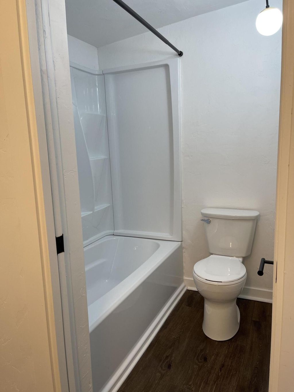 The bathroom has been fully refreshed with a new vanity topped with quartz, LVP flooring, and a new tub and shower surround. Additional upgrades include a 3-year-old ductless mini-split heating and cooling system, updated doors, modern lighting, a new electrical panel, and a 3-year-old water heater.