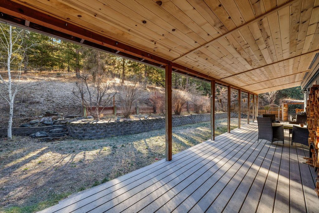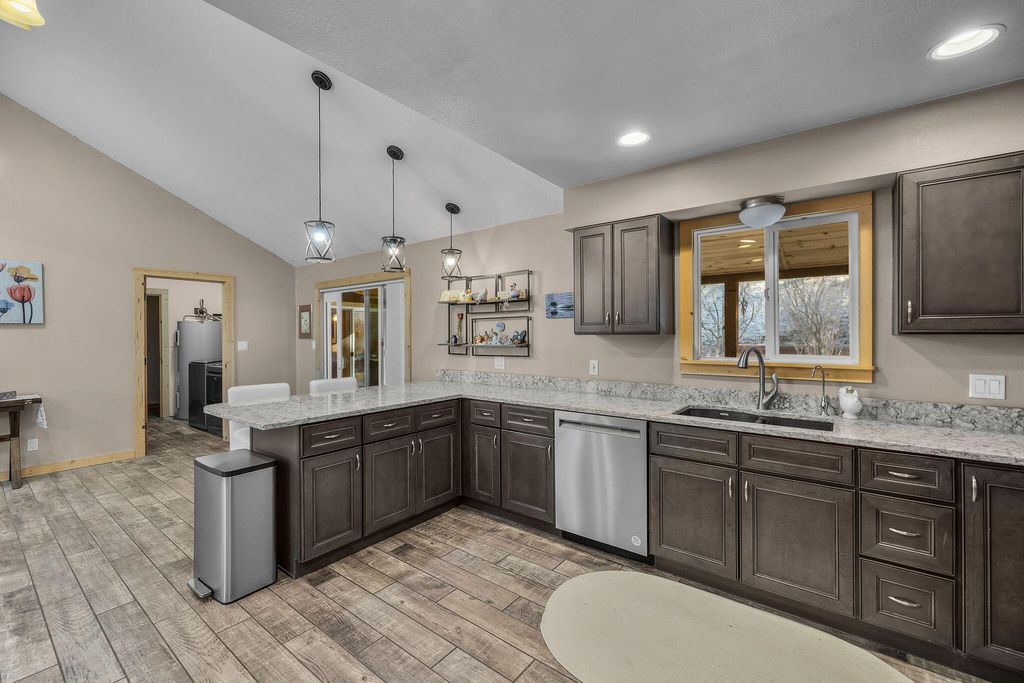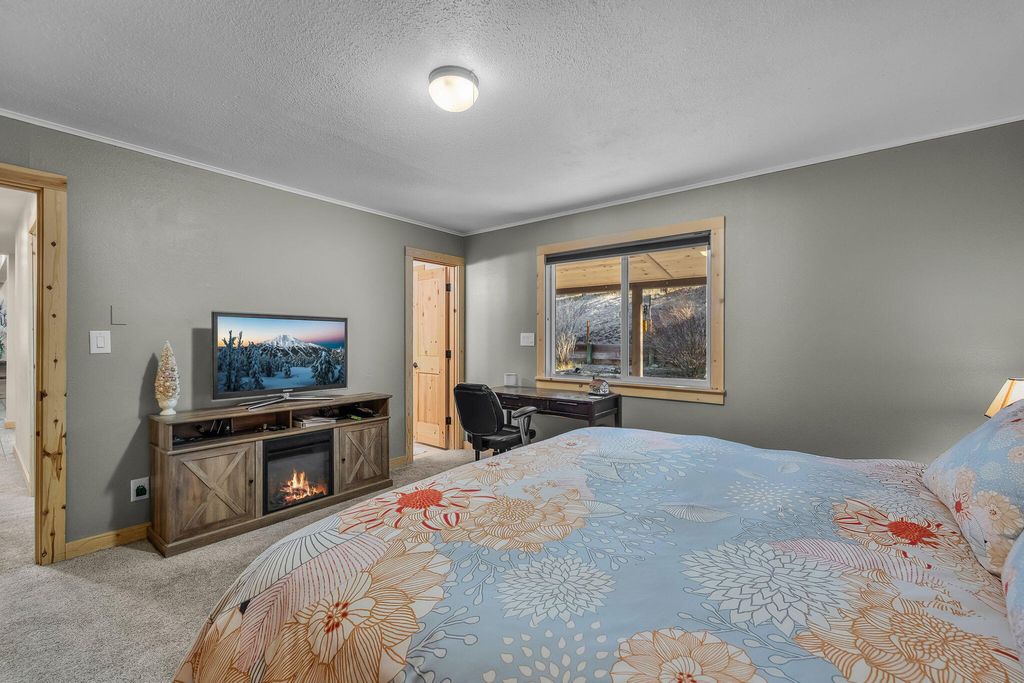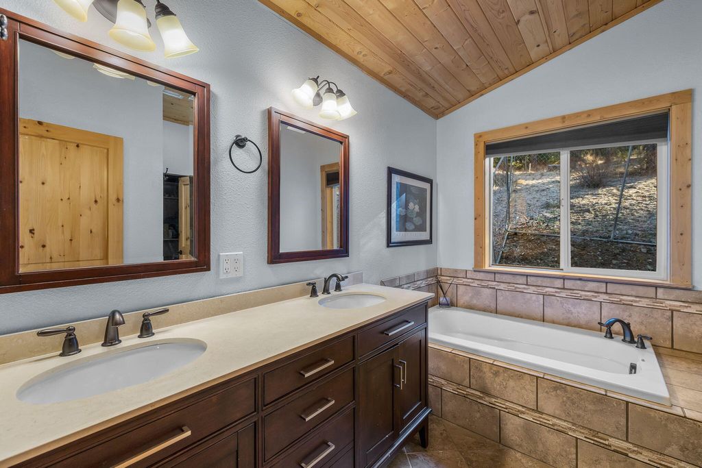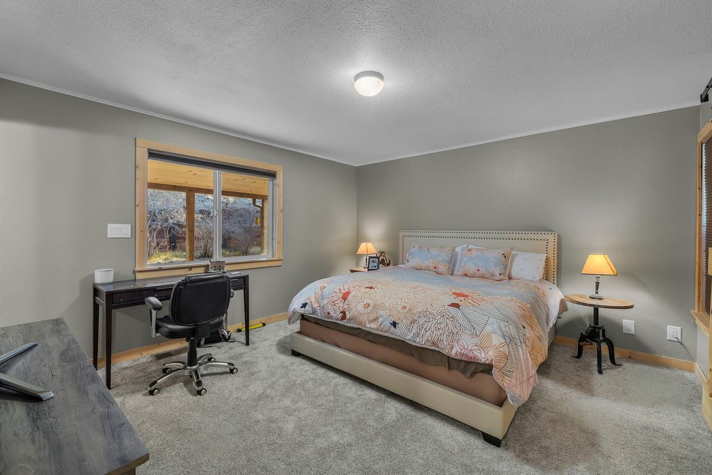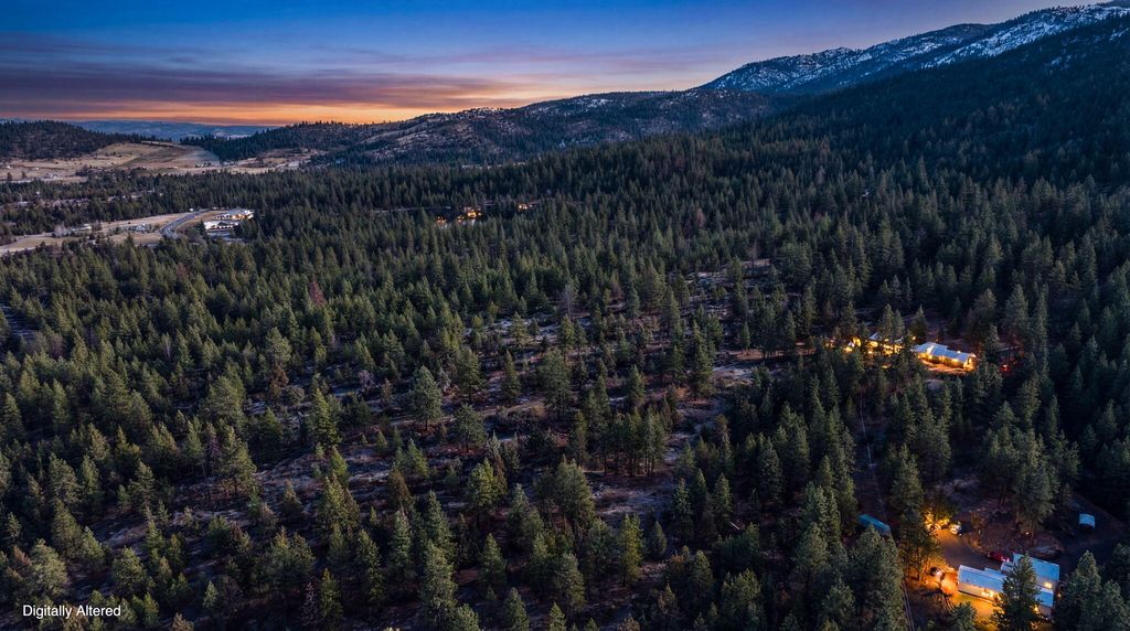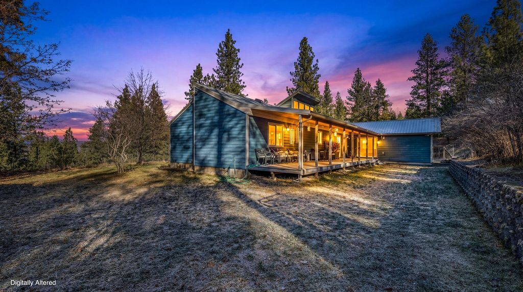 Beautiful five-acre property nestled in the pines and bordering BLM land, offering privacy and access to the outdoors. This 2,412 sq ft home features four bedrooms and three bathrooms with pine accents throughout. The main primary suite includes a sliding glass door to the covered back deck, double vanity, soaking tub, tile shower, and walk-in closet. A second primary suite offers a shower surround and closet with bypass barn doors. Stay comfortable year-round with a Blaze King woodstove and a ducted heat pump. The 1,040 sq ft detached garage/shop includes a concrete floor, insulation, sheetrock, 220 power, and an oil monitor stove. Additional features include a 12′ x 10′ hickory storage shed, fenced backyard for pets, partial perimeter fencing, well, septic system, backup generator wired to the house, and a circular driveway. This property is situated only a few minutes away from town.