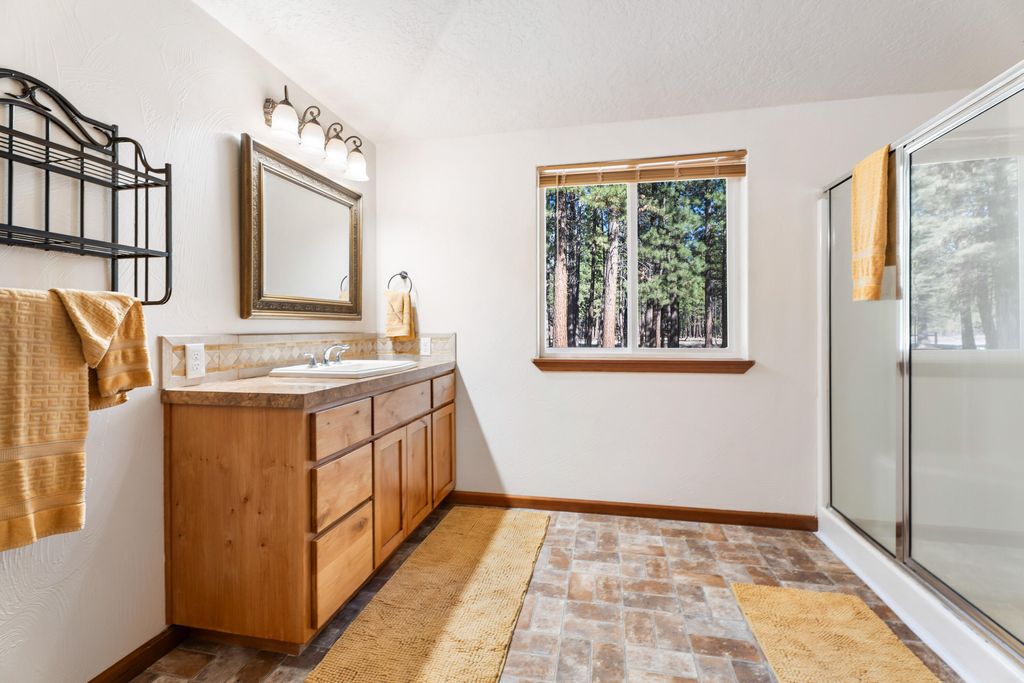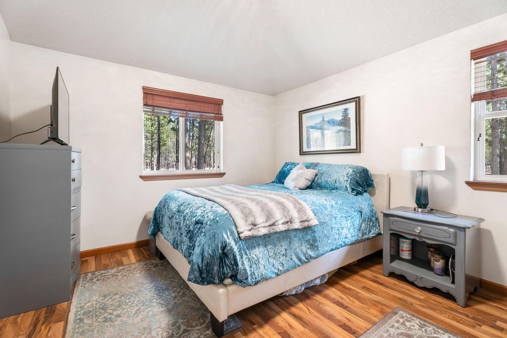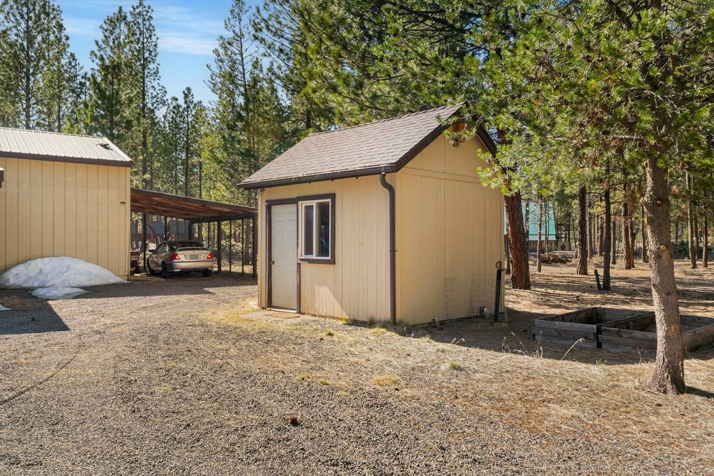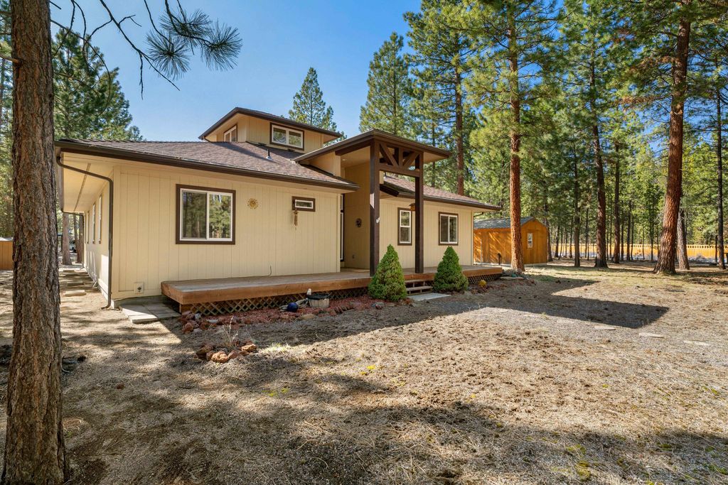 Stunning home siting on a corner lot in South La Pine is a must see! With high vaulted ceilings, open floor plan, large primary bedroom and bathroom plus a good sized 2nd bedroom, the entire home is very bright and spacious. Covered sunroom/porch great for sitting and looking at the natural landscaping full of beautiful Ponderosa Pine trees! Large shop with covered car ports, well house and storage shed with electric. Fully fenced property. Take your ATV, snowmobile, horses on one of the many trails close to this property. New ATT Septic System. This home has all you need to live comfortably. Tile counter tops in living with large spacious kitchen and eating area.